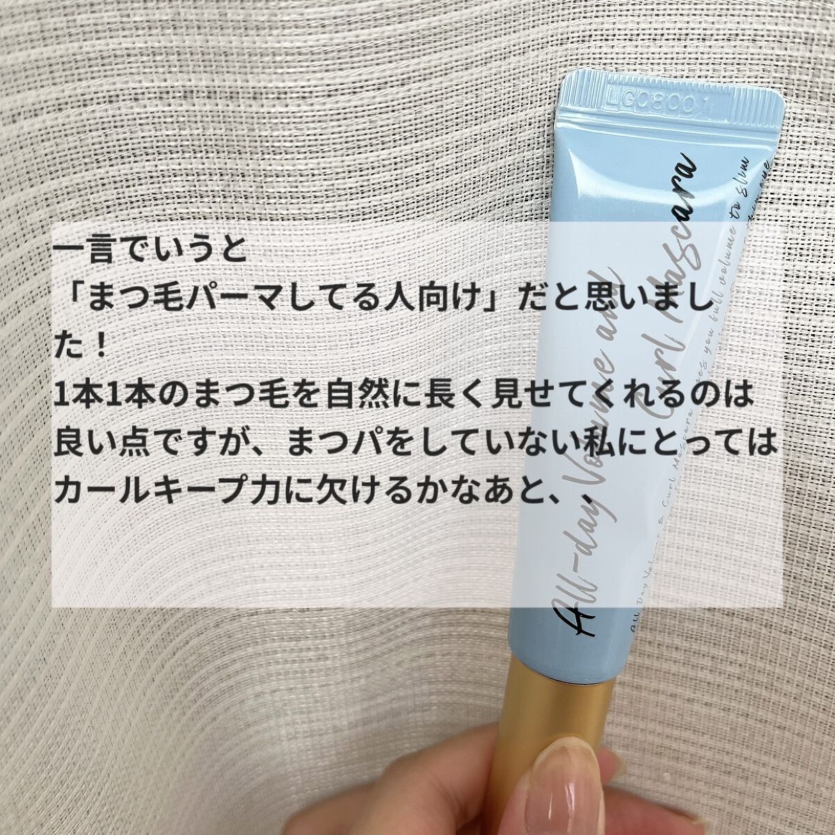 Milk Touch オールデイ ボリュームアンドカールマスカラです😌 細目のブラシで塗りやすく、ボリュームが出てカールアップもするなと思いました✨ 落ちにくいからちょっと落としにくさも感じました。 カールキープされる