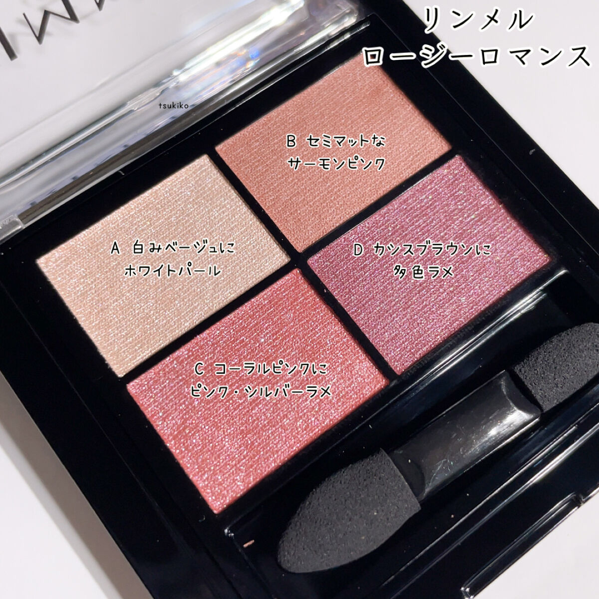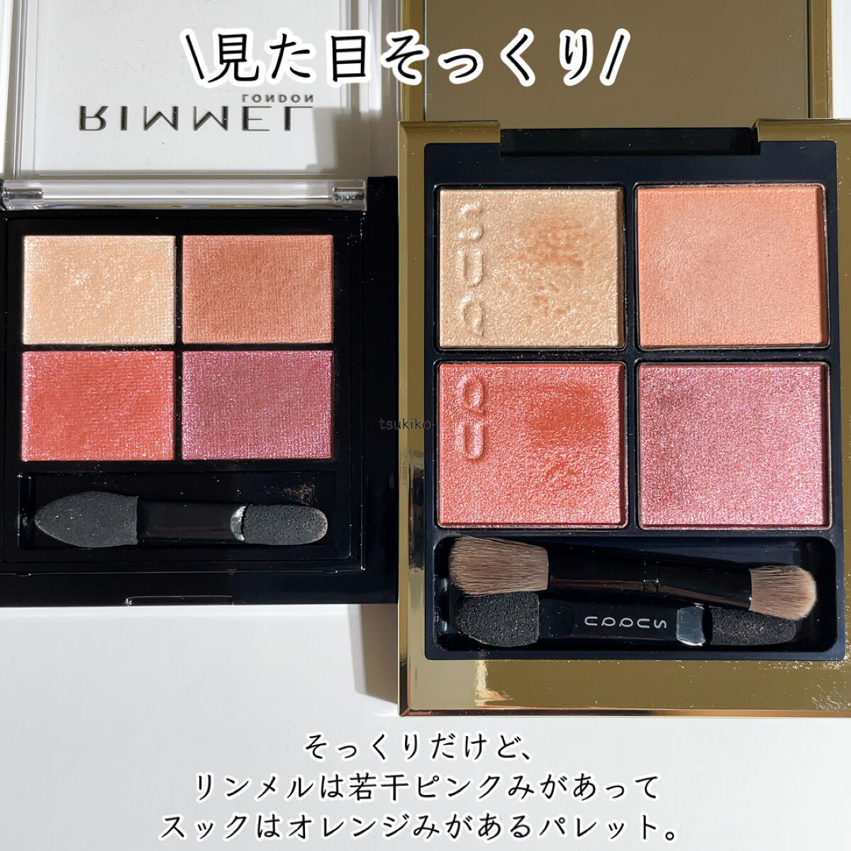 左上のカラーがベージュ系、右上がオレンジ系、左下がピンク系、右下がパープル系の4色。 全体的に柔らかめの発色がスック、パキッとした発色がリンメル。 共通しているのは、どちらのパレットもツヤ感があり、色を重ねても濁らず綺麗なカラーに仕上がるところ🎨