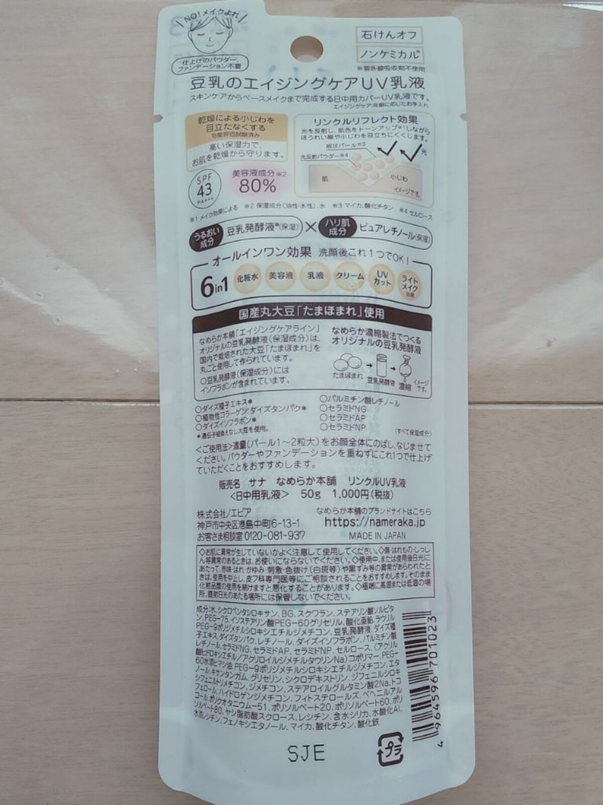 1本6役(化粧水・美容液・乳液・クリーム・UVカット・ライトメイク効果)色付き乳液でほうれい線・表情じわのメイクよれが気にならない日中用カバーUV乳液です。 豆乳発酵液×ピュアレチノール配合なめらか本舗エイジングケアライン共通の、滋賀県産丸大豆たまほまれ使用の豆乳発酵液とピュアレチノールを配合。 リンクルリフレクト効果でほうれい線・小じわが目立たない板状パールと光反射パウダーが光を反射するリンクルリフレクト効果で、時間が経ってもほうれい線・小じわのメイクよれを目立たせません。