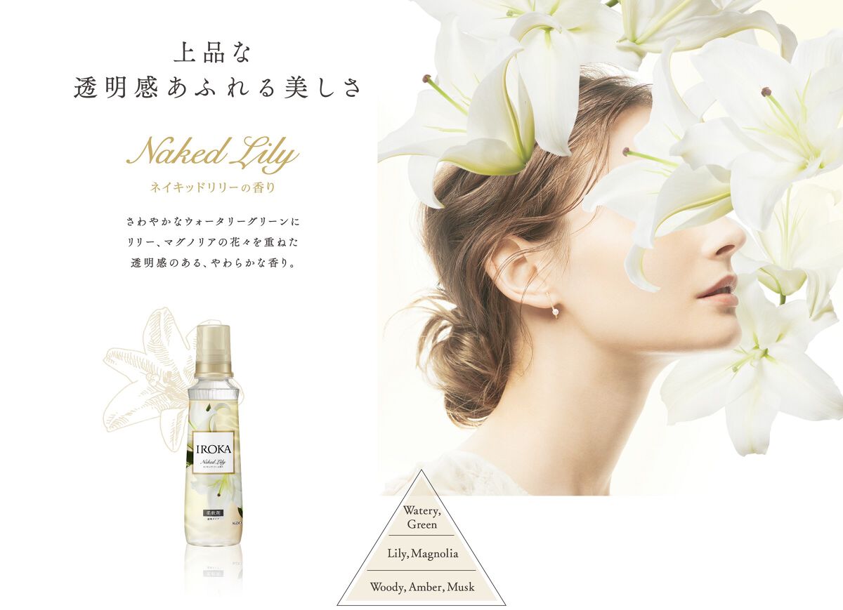 - 香水のように香り高い プレミアム柔軟剤IROKA。 素肌のあたたかさを想わせる「ピュアムスク*1」と、香水には欠かせない「高級アンバー」を贅沢*2に使用。 香水のように上質、なのに透明感あふれるその香りは、あなたらしい美しさを、上品にさりげなく引き立てる。 透明感あふれる上品な「ネイキッドリリー」の香り。 *1天然ムスク香気の主成分と同構造のl-Muscone *2当社柔軟剤比
