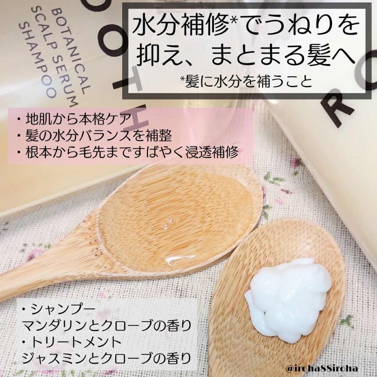 - 水分補修※でうねりを抑え、まとまる髪へ。 ROOTHは複数のスパイスをブレンドした、 「モイスチャースパイスセラム※」配合で、健やかな髪と地肌に導きます。 ※髪に水分を補う事 ※シャンプー・トリートメント:ウコン根茎エキス、チョウジエキス、トウシキミ果実/種子油、コメヌカ油、スクワラン(すべて保湿成分) インシャワーヘアセラム・マルチオイル:ウコン根エキス、チョウジつぼみ油、トウシキミ果実/種子油、コメヌカ油、スクワラン(すべて保湿成分)
