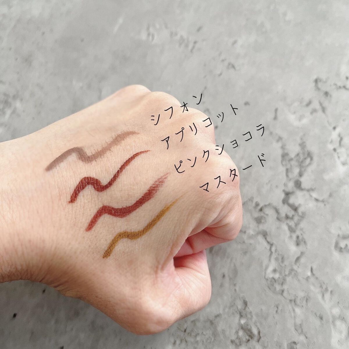 - 筆先までずっとなめらか、目尻で感動するリキッドアイライナー。 必要な量が肌にのる新設計で、まぶたの上をすべるような、滑らかな描き心地。しなやかでコシのある筆が、筆圧のコントロールを容易にし、太いラインも細いラインも思い通りに仕上げます。水、汗、涙に強いウォータープルーフタイプなのに、通常洗顔で簡単オフ。肌に色素が残らない顔料を使用。5種類の美容液成分を従来品の200%配合し、メイクしながら目元ケアまで。 ●ブラウンブラック ※2020年9月12日 バラエティショップ先行発売 ●漆黒ブラック ※2020年12月頃発売予定 ●ナチュラルブラウン ※2020年12月頃発売予定 ●シフォンブラウン 「毎日メイクに透明感と抜け感」 ブラウンでも、グレーでも、ベージュでもないニュアンスカラー。 自然な印影で素の目元を際立て、頑張りすぎない、ふんわりとした目元に。 ●アプリコットブラウン 「じゅわっと血色感。 肌に馴染むおしゃれカラー」 温かみのあるアプリコットがじゅわっと滲む血色感を目元に演出。 肌馴染みが良いので、カラーライナーに抵抗がある方もブラウンの延長線上で楽しめる、使いやすい色味です。 ”ちょっとオシャレ”な空気感を演出するカラー。 ●ピンクショコラ アイライナー 「ピンクが溶け込む濃厚ブラウン」 肌馴染みが良く、目元にじんわり血色感をプラス。 さりげなく女性らしさが加速するようなカラー。 ●ピスタチオラテ (2022年7月29日(金)発売) 「“目尻”に抜け感アクセント」 肌に馴染むのに映える絶妙なグリーン。 トレンドカラーに“くすみ”と“抜け感”をプラスしたまろやかな発色。 ●マスタードブラウン 「“イエロー”が揺れる、大人の洒落色」 (2022年7月29日(金)発売) まるで太陽のような暖かさを感じる新しいブラウン。 ほんのり感じるイエローでメイクが一気に垢抜ける稀有な色。 ●シフォンピンク(2023年2月10日発売) 「ふんわり柔らか"まろみピンク"」 甘くなりすぎない青みニュアンスで目元の透明感UP。 目元を引き締め、ピンクメイクにありがちな腫れぼったさを解消。 ●ミルクカプチーノ(2023年4月21日発売) まろやかな深みの“優しい締め色” どんなメイクにも合わせやすいカラー。 自然な陰影でさりげなく目幅を拡張します。 ●グレーカシミア(2023年10月1日発売) ブラウンがほんのり溶け込んだ、暖色グレー まろやかな発色で、パーソナルカラーを問わず肌に馴染む 目元の陰影になりすまし、抜け感と目力を欲張りに叶える ●ダークフィグ(2024年6月1日発売) するする”なめらか。描きやすいのに、落ちにくい。 クッキリ可愛いほの甘ダークブラウン ●ピーチモカ(2024年8月1日発売) ふわっと自然に盛れる“桃色ブラウン” ほんのり血色感で目元にうるみ感を演出 ●スターダストブラウン(2024年12月11日発売) キラッと繊細に輝く''星屑ブラウン'' 透け感のあるダークブラウンの色味とラメの輝きが、目元に艶のある立体感を演出 ●チャコールモカ(2025年4月10日発売) 目元を締める''深みグレージュ'' 黄みや赤みに偏りすぎない絶妙な色設計で、自然に目元を強調