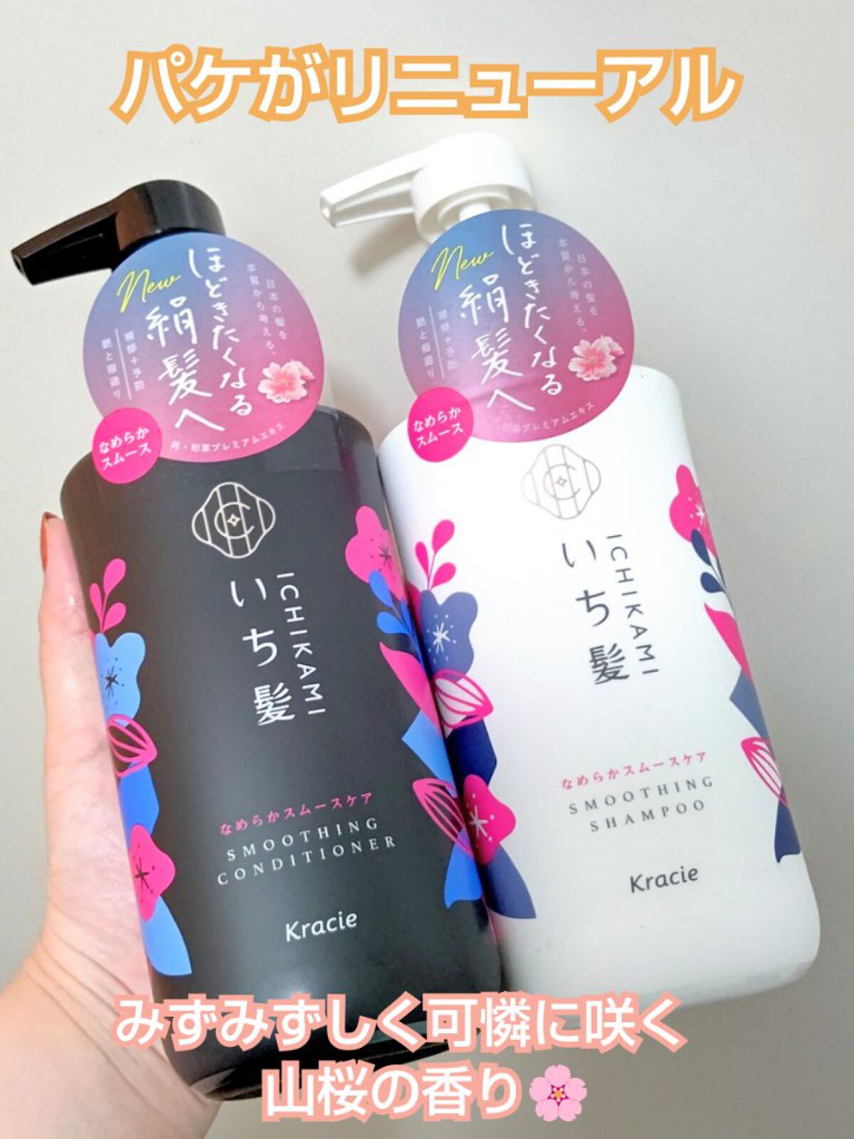 いち髪 なめらかスムースケア シャンプー480ml コンディショナー480g久しぶりのいち髪!!セットで800〜900円くらいでした😳1週間ちょい使った感想です。シャンプーはみずみずしく可憐な山桜 三分咲きの香り🌸泡立ちは普通かな🫧流すと髪が...