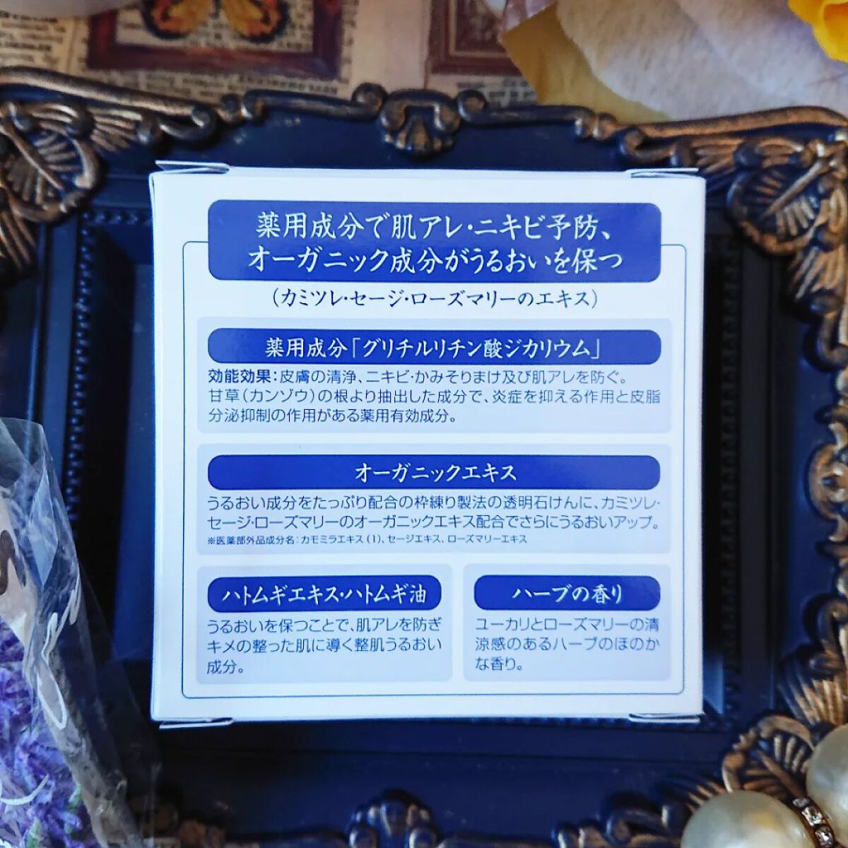 薬用ハトムギ透明石けんの紹介です肌荒れ、ニキビを防ぐ薬用洗顔石けんです有効成分グリチルリチン酸ジカリウムを配合、ハトムギ(ヨクイニンエキスとハトムギ油)オーガニックエキス(カモミラエキス(1)、セージエキス、ローズマリーエキス)がうるおいを保...