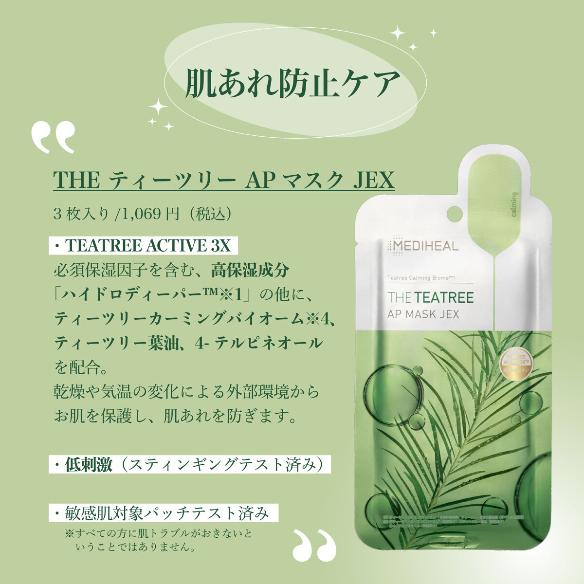 必須保湿因子を含むメディヒール独自開発の高保湿成分「ハイドロディーパー」や、ティーツリーカーミングバイオーム、ティーツリー葉油を配合。 乾燥や気温の変化による外部環境からお肌を保護し、肌あれを防いでくれる。 低刺激(スティンギングテスト済み) 敏感肌対象パッチテスト済み