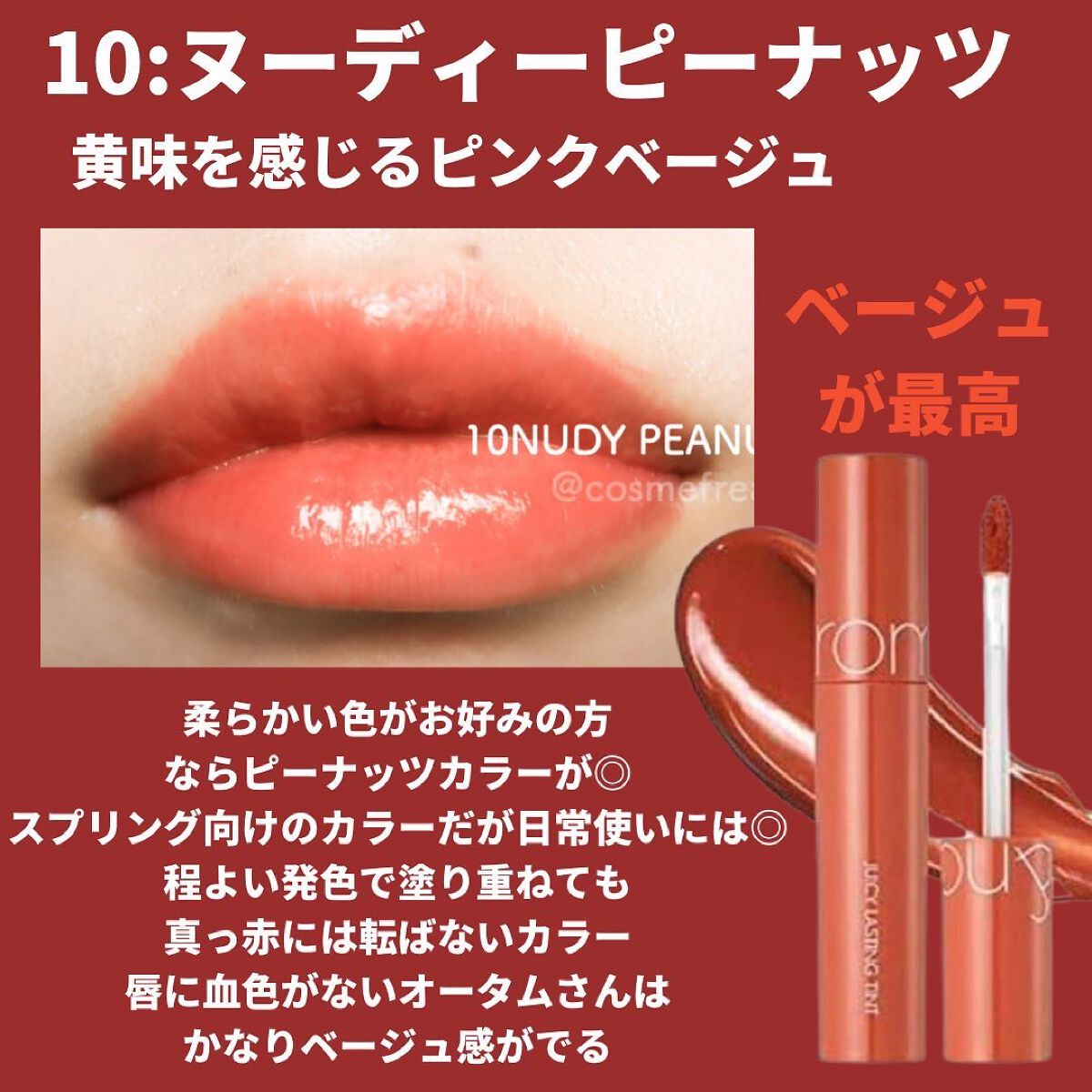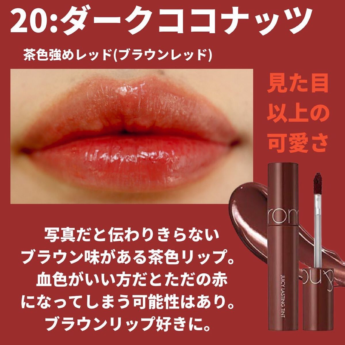 ロムアンドのジューシーラスティングティントで解決! 色持ちの良さは勿論のこと、ツヤ感やうるおいとも両立が可能です😄🌸 19 ALMOND ROSEはくすみ感のあるローズカラーでかわいくてお気に入り! 絶妙な色合いなのですが、元から血色の良い唇のように仕上げてくれ、ナチュラルになじんでくれるので何方でも使いやすいと思います。 20 DARK COCONUTは塗り重ねる程深みを出すことのできる、ダークなカラー。 チョコレートのような色味で、いつもよりも大人に、ちょっと背伸びをしたいなという時に特にオススメです。