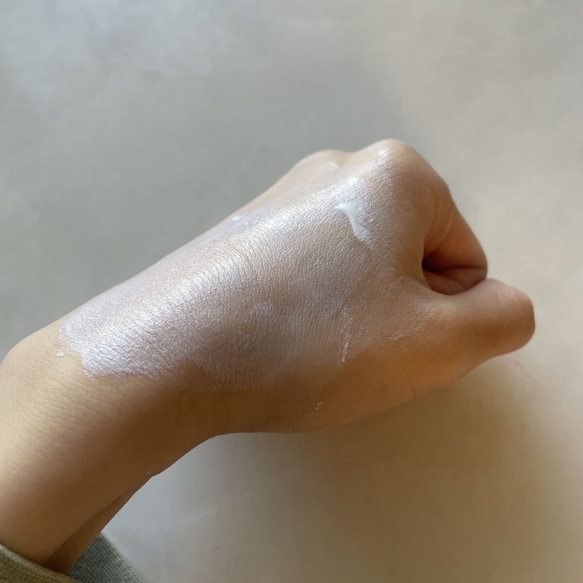 実際に手に乗せてみるのちょっと白っぽいかなと一瞬思うけど、伸ばすと綺麗な艶が! 自然な艶が上品にしてくれる最高な下地! 変性アルコールはエタノールに入るそうです もし気になる方がいたら絶対試した方がいいと思います!