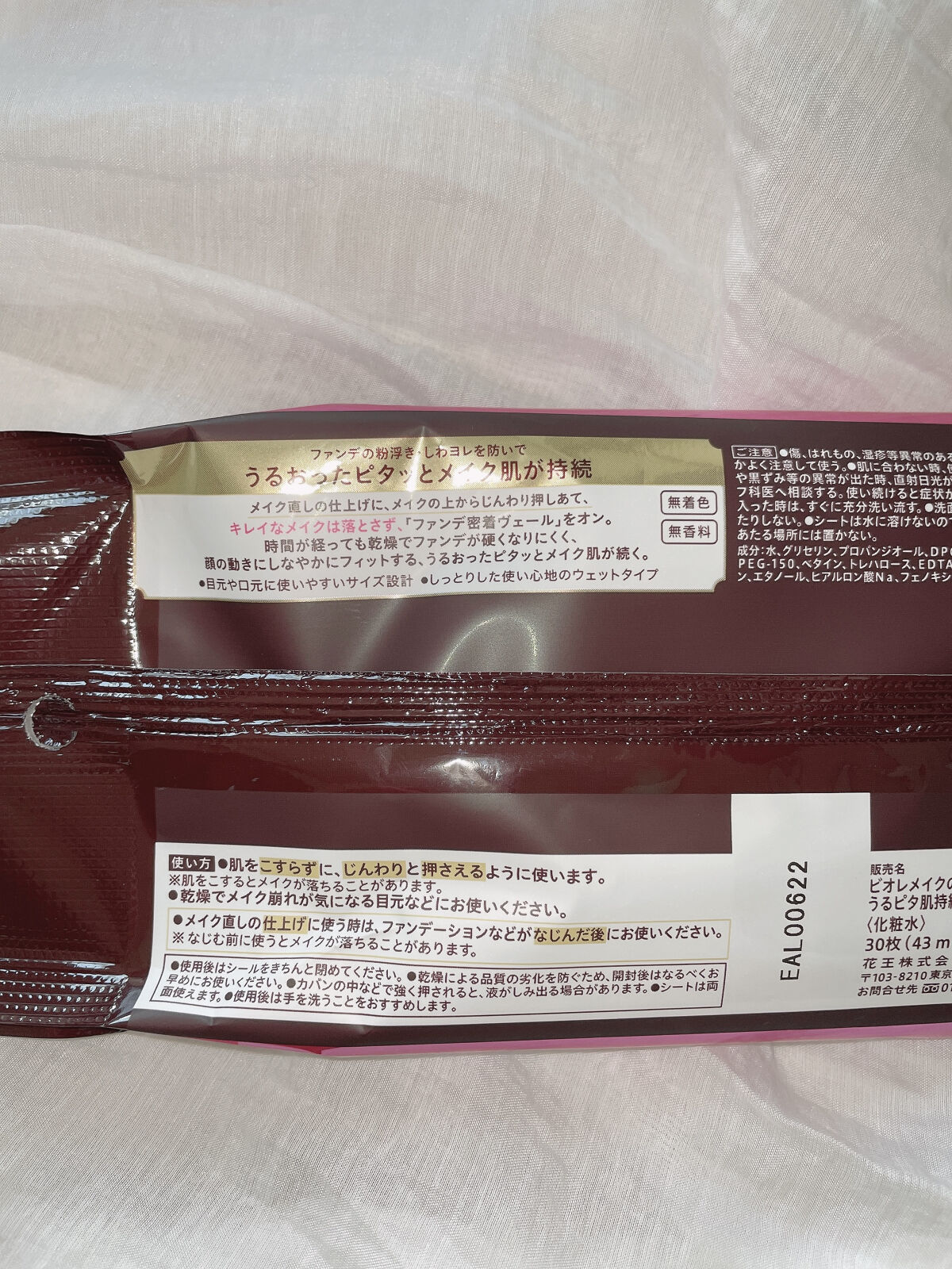 - <ビオレメイクの上からうるピタ肌持続シート> 水、グリセリン、プロパンジオール、DPG、メチルグルセス-20、PEG-32、PEG-150、ベタイン、トレハロース、EDTA-2Na、イソセテス-20、トロメタミン、エタノール、ヒアルロン酸Na、フェノキシエタノール、メチルパラベン