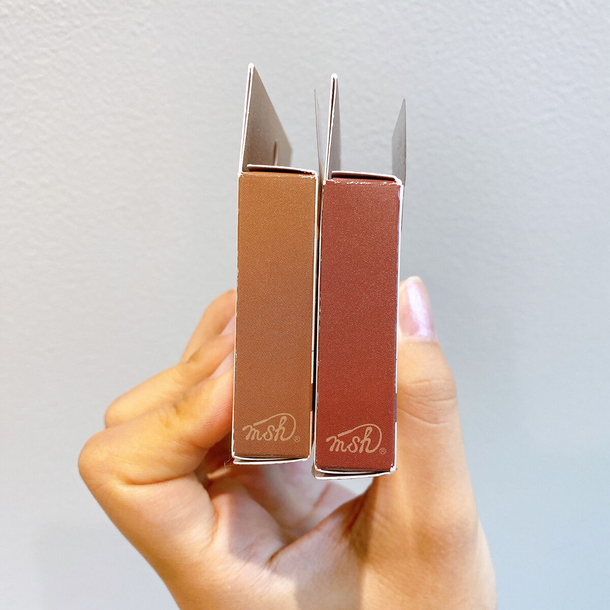 カラーはピンク系ブラウンのマロンブラウン🌰 KATEで慣れてると淡いカラーがとても薄く感じる! 全体的にふんわりした雰囲気のカラーで、中間色はノーズシャドウとしても使えそう✨ 付属のブラシも使いやすくておすすめです◎ パッケージも可愛いので是非手に取ってみてください💓