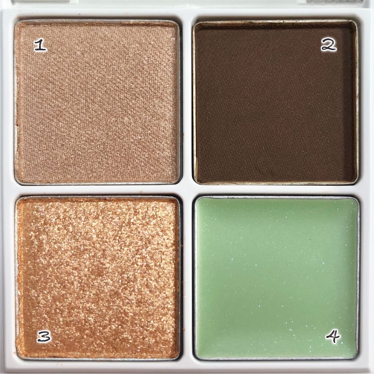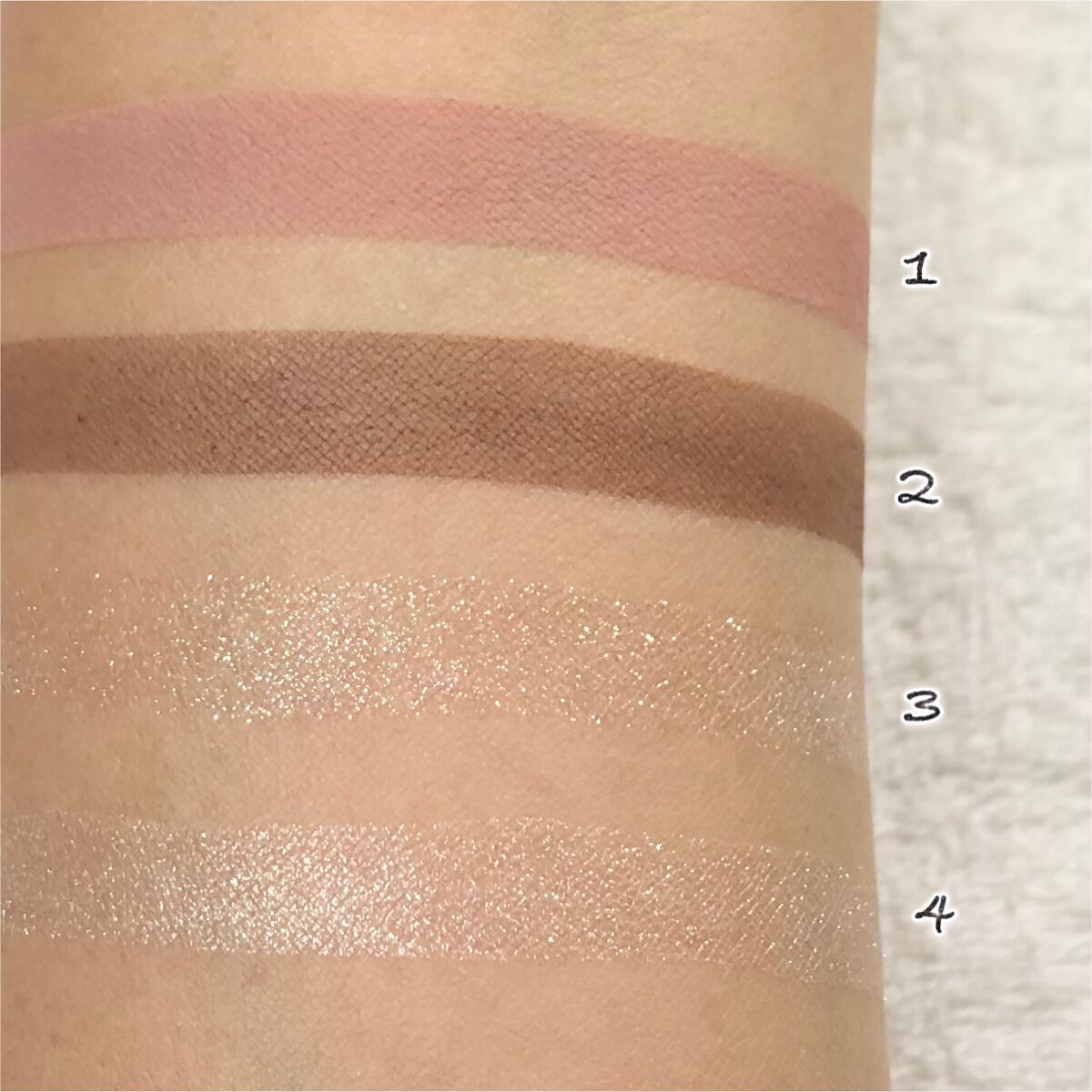 全体的には、名前のとおりヌーディーな印象☺️定番色「01 本命のブラウン」と似てるんだけど、今回の「104 本能のヌードベージュ」の方が、よりヌーディーなカラーとなっておりまする💁🏻♀️ 左上のベージュカラー(1番)は、基本的にはマットカラーなんだけど、ほんのりラメも入ってるから、のっぺりとした印象にならなくて良き🥰 4番のカラーは、ハイライトとして使うこともできるし、個人的には涙袋に使っても良いのではないかと思っておりまする👻 こちらは、全体的にしっとりとしたテクスチャーとなっておりまする💖そして、上2色のマットカラーが、結構しっかり発色してくれます❣️ 右下のハイライトカラーも、「104 本能のヌードベージュ」ほど白っぽくならないので、さりげなくハイライトを入れたい人にピッタリ✨