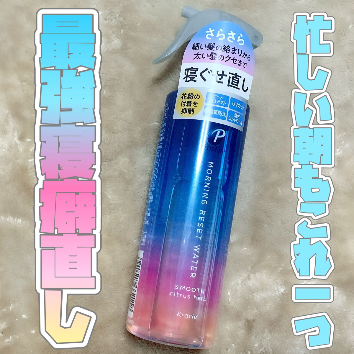 寝ぐせ直しとダメージケアができ、心地よい香りも楽しめる寝ぐせ直しウォーター ●細い髪の絡まりから太い髪のクセ・ハネまでしっかりリセット コスパが良い UVカットやヒートプロテクト、静電気防止、湿気コントロールなど、様々な機能がある シトラスハーブの香りで、花粉の付着を抑制し、ダメージ補修成分(Wアミノ酸)配合
