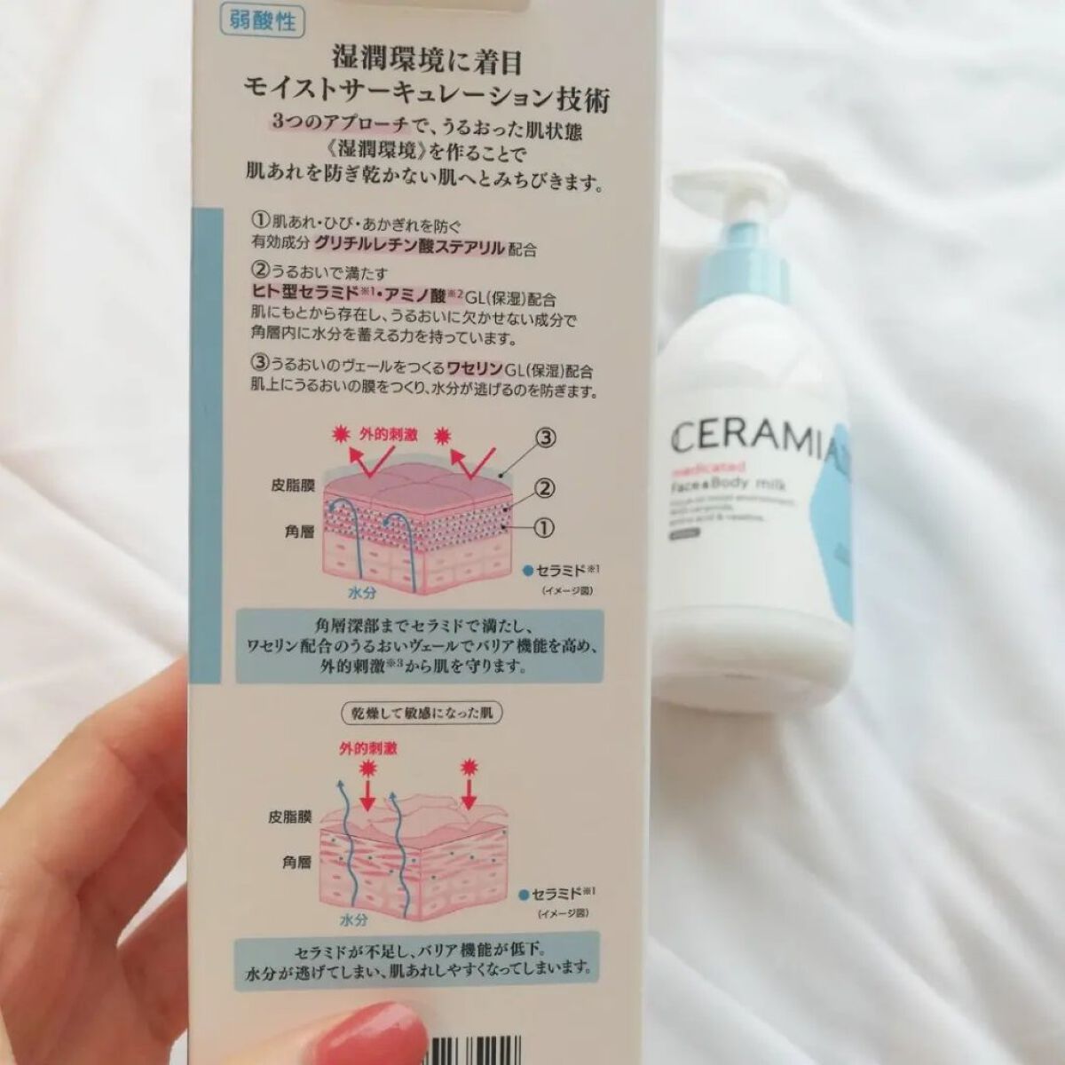 敏感肌の方や赤ちゃんにも使える薬用スキンミルク🤍 3つのアプローチで肌あれを防ぎ乾かない肌へ✨ 有効成分「グリチルレチン酸ステリアル」配合 うるおいで満たす「ヒト型セラミド*・アミノ酸*¹GL(保湿)」配合 ミルクタイプなので伸びが良くてすごく塗りやすいです🤍✨ 塗ったあとのベタつきはなく、子供たちも気に入って使ってます🙌