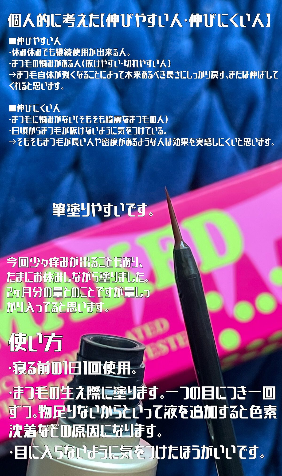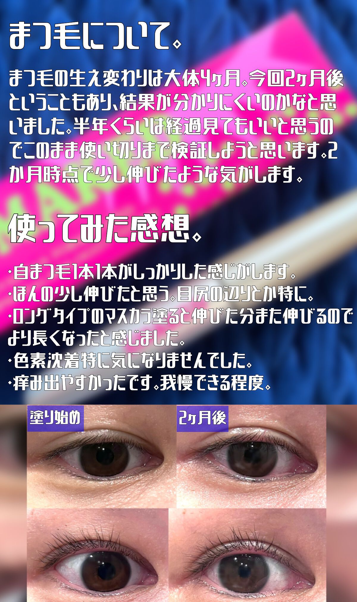目頭側のスカスカ感がなくなった →4~5本しか無かったのに新しい毛がじわじわと増えてきました😭✨ 1ヶ月後くらいから効果をちゃんと感じられたこと →元々のまつ毛の長さも伸びたし、新しい毛が生えてきたことで生え際の地肌がちゃんと毛で埋まってきた🥹 数年間ずっと悩んでたけど買って良かったです💪 今後はアイケアも取り入れつつ継続します!