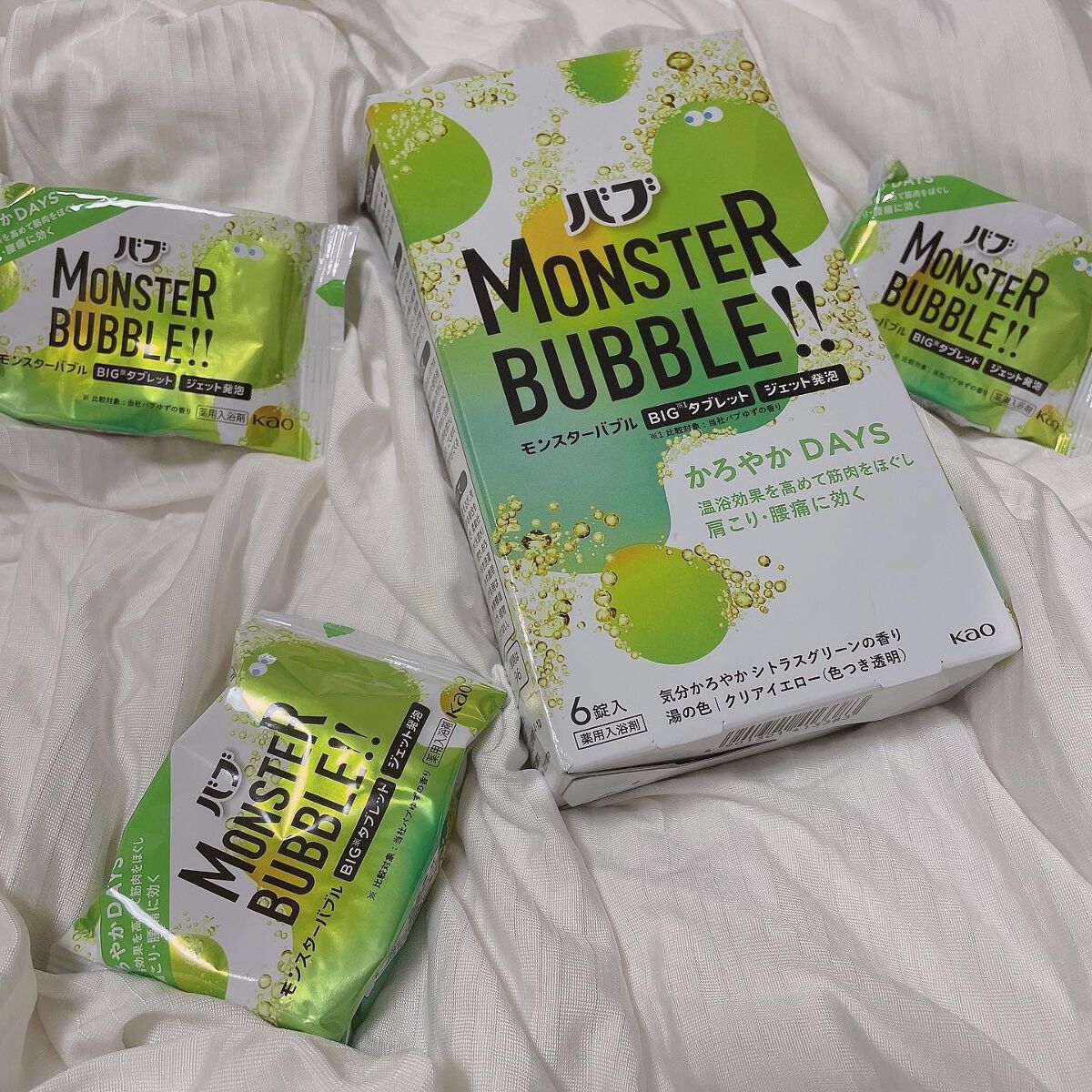 温浴効果を高めて筋肉をほぐし 肩こり・腰痛に効く かろやかDAYS 気分かろやかシトラスグリーンの香り。 シトラスグリーンの爽やかな香りもとても良かったです。全体的な使用感から、「かろやかDAYS」というネーミングは本当にこの商品にピッタリだなと思いました💗 990円で6錠入りなので、同じ値段で4個入りのモンスターバブルMEGA級と比較すると少しお安め。