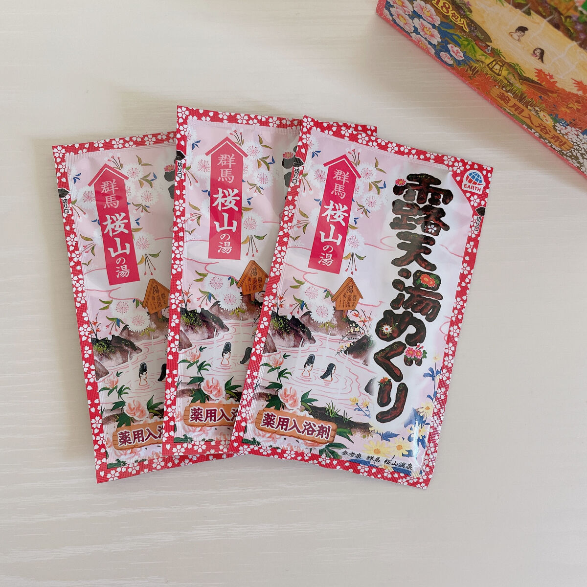 各地の温泉気分を楽しめるアソートタイプの入浴剤。秋田・長野・群馬・青森の有名露天湯を参考にして作り上げたそうです! 🔴群馬桜山の湯 満開の花々の香り 乳桜色(にごり) なかなか旅行に行けないけどお風呂で旅行気分を楽しめてハマってます!!
