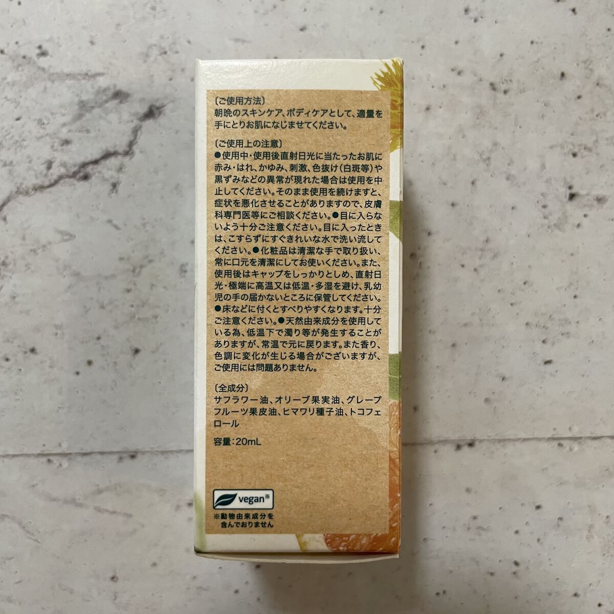 100%天然由来成分使用のオーガニック植物オイル✨ ミネラルオイル(鉱物油)と比べて分子量が小さく、さらっと肌に浸透しやすいんだって! お風呂場で濡れた肌にさっと使えるのと、ベタベタしないからすぐに服を着られるという使いやすさ! 妊娠線予防のために買ったのがきっかけだったんだけど香りが好きでずっと使ってます!