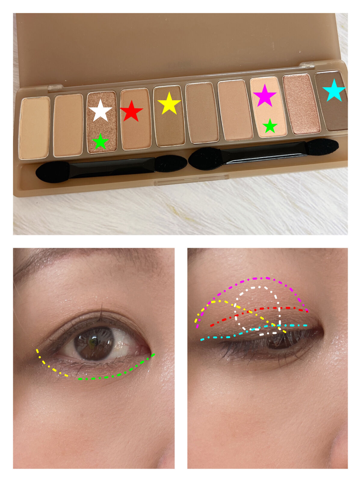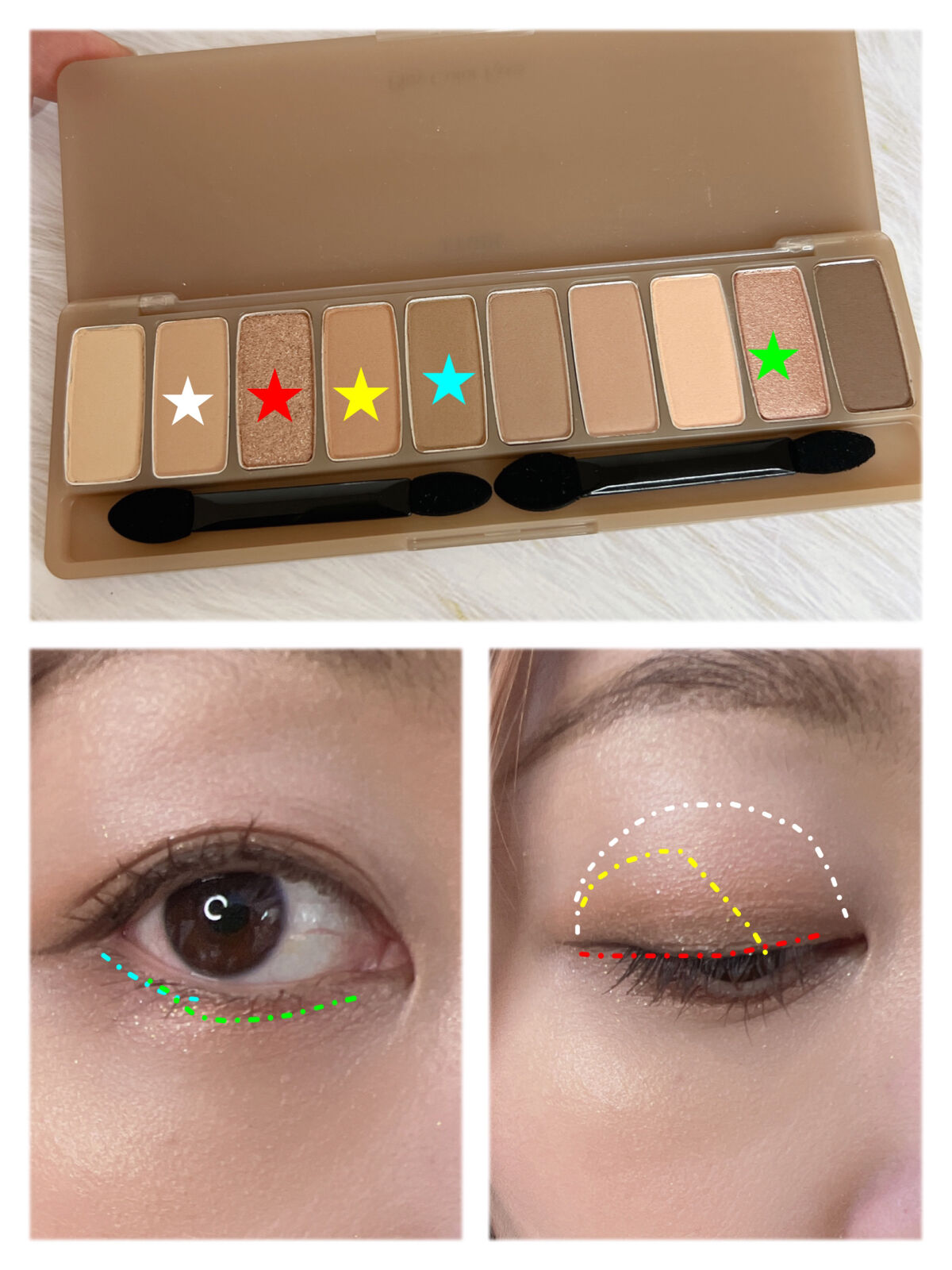 - 肌なじみの良い、鮮やかな発色で目元を華やかに彩る捨て色なしの10色アイシャドウパレット 異なる3種のテクスチャーを自由に組み合わせて、グラデーションも思いのままに。 NEW 2023.4 ・肌トーンにあう配色を詰め込んだトレンドカラー 肌トーンに合わせて、自分に似合うトレンドカラーが楽しめる♡ パーソナルカラー×トレンドカラーの掛け合わせパレットで、デイリーメイクもスペシャルメイクも気分にあわせてなりたい自分に! ・むにゅっとジェル質感ラメで高密着、煌めく目元 パレットの中でもポイントとなる大きめ粒子のラメは、ジェルのような新質感で落ちにくく肌にぴったりと密着します。キラキラとした目元をキープします。 ・使うカラーは大きめに!リアル捨て色なしパレット ベースやラメのよく使うカラーと締め色や濃い色等の減りが少ないカラーを異なるサイズで詰め込んだ、リアル捨て色なしパレット! <使用方法> 付属のデュアルシャドウブラシでベースカラーをまぶた全体に塗り広げます。細いブラシでグラデーションや目尻、アイライン、涙袋などのポイントカラーをのせて仕上げます。