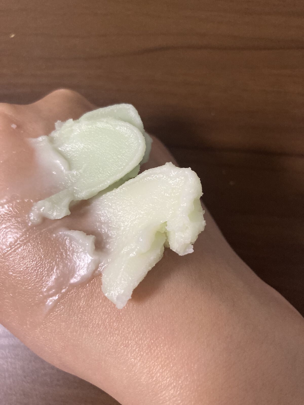 実際は綺麗に使い切れた訳ではなくて、2枚目の画像では邪道ですが爪楊枝で取りきれなかったスクラブを落としてます🙈 バズるだけあって、使った後の顔が洗いたての食器のようにツルツルになりました。 乾燥肌の人には少し効果が強すぎるかもしれません。 ただ、ずっとお風呂場に置いていたらだんだん柔らかくなってしまいました。 それでも顔には使えましたが、塗る時にぐしゃっとつぶれてしまうので、中盤くらいからは直接指にとって水で練って、ボディスクラブとして使いました。 ボディスクラブとしても優秀だと思いました。 もう一本あるのでリピは確定ですが、次はお風呂場に放置しないようにしたいと思います。 ボディスクラブ専用にしちゃうのもありですね。