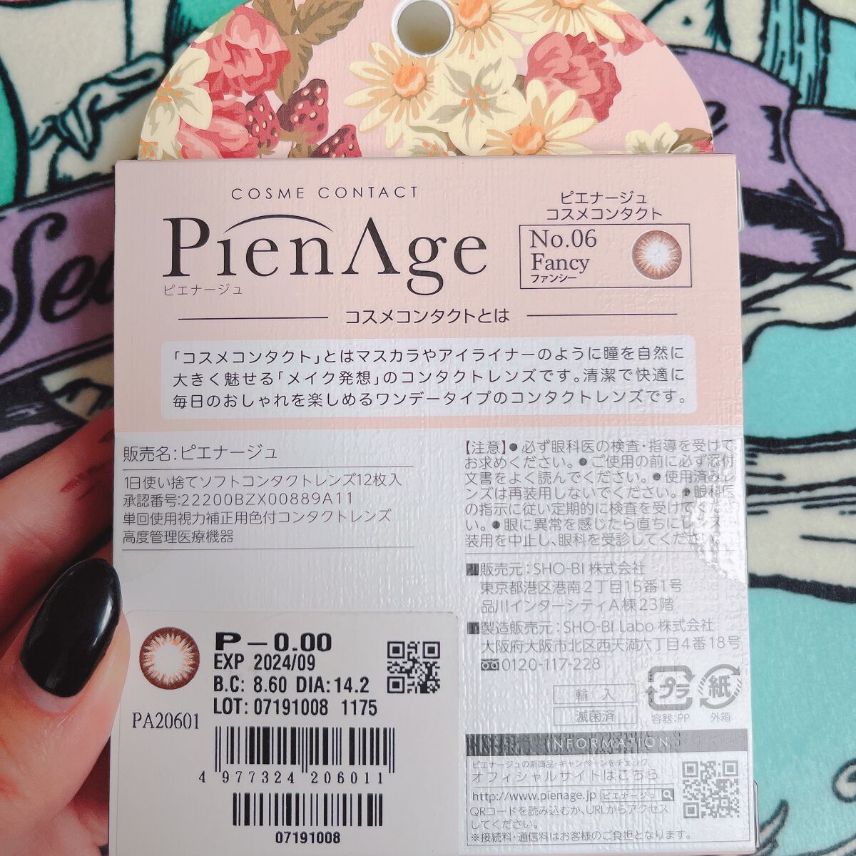 - なりたい瞳を叶える魔法。瞳に優しく、美しいヒミツ。 つけるだけで女性がなりたい自分に近づくコスメコンタクト「PienAge」 使用期間:1日使い捨て(ソフトコンタクトレンズ) 度数:±0.00D、-0.50D~-6.00D(0.25Dステップ)、-6.50D~-8.00D(0.50Dステップ) レンズ直径(DIA):14.0mm/14.2mm レンズ着色直径 :13.2mm/13.6mm ベースカーブ(BC):8.6mm 含水率:38%