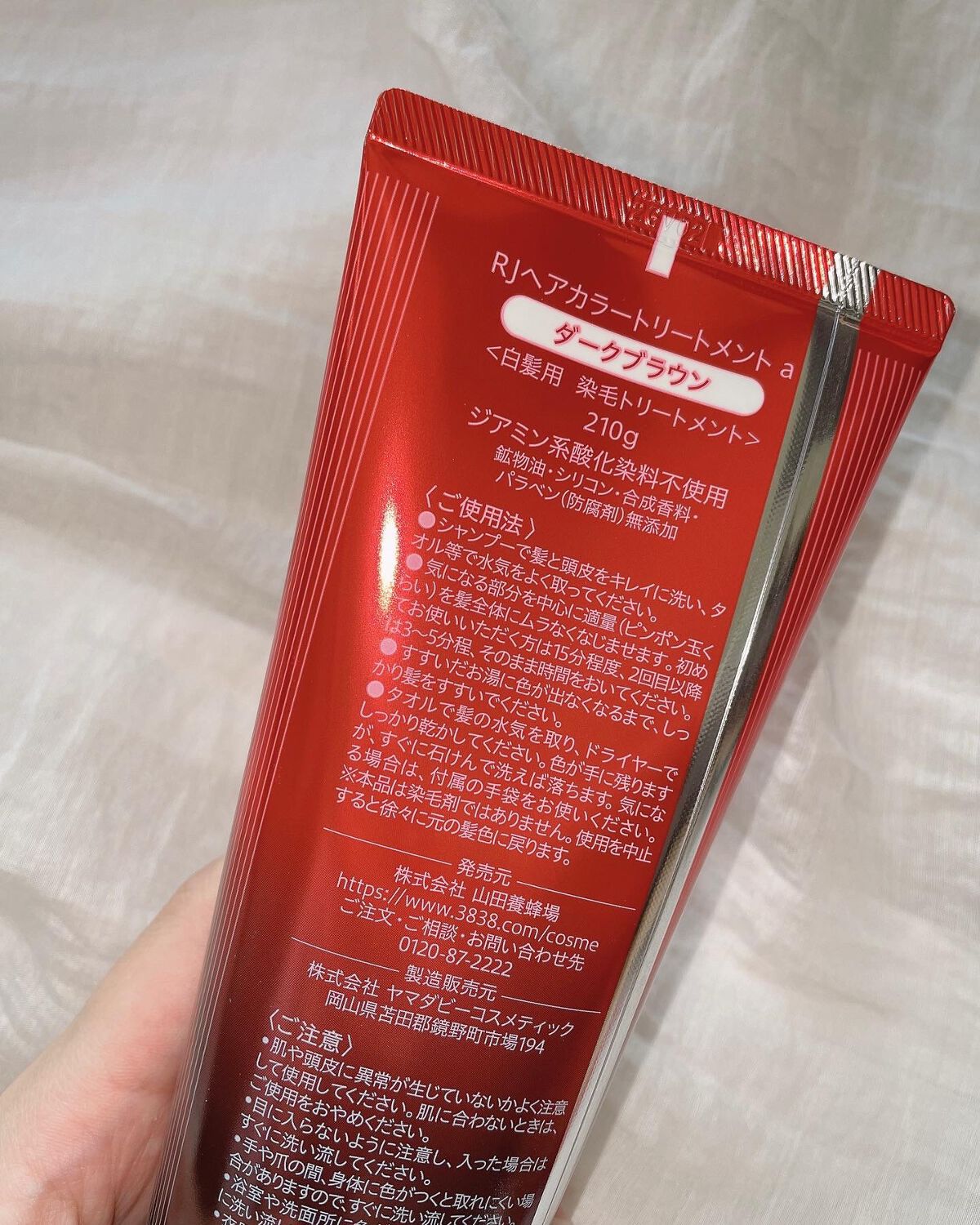 山田養蜂場の、アピセラピーコスメティクスよりRJヘアカラートリートメント ご紹介✨️ 色はダークブラウン 使い方は簡単で、シャンプー後、ビニール手袋して手に取り白髪部分に塗ってちょっと放置。 ヘアカラーなのにトリートメントも出来るのはポイント高め 白髪染めでお悩みの方は是非(*^^*)