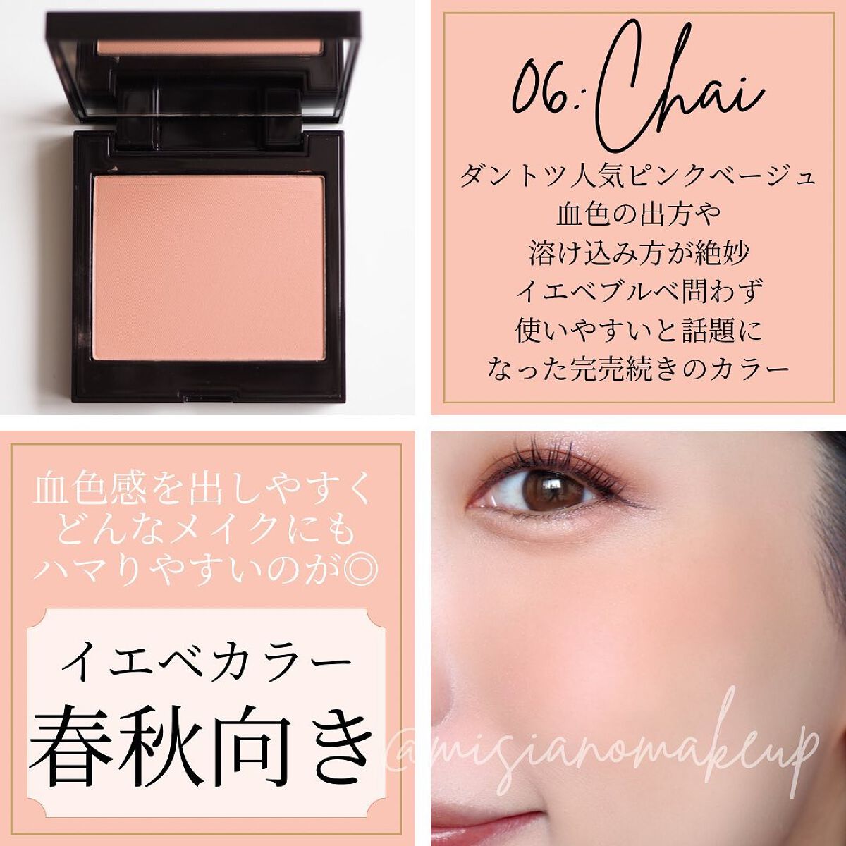 チークをあまり使わない、濃いチークが苦手という方にもこちらのチークはすごくおすすめ。 06のチャイは人を選ばず、幅広く支持されている印象です。 とにかく発色が自然。目立つラメやパールは含まれていないため、より自然、、!ナチュラル、、、!!!
