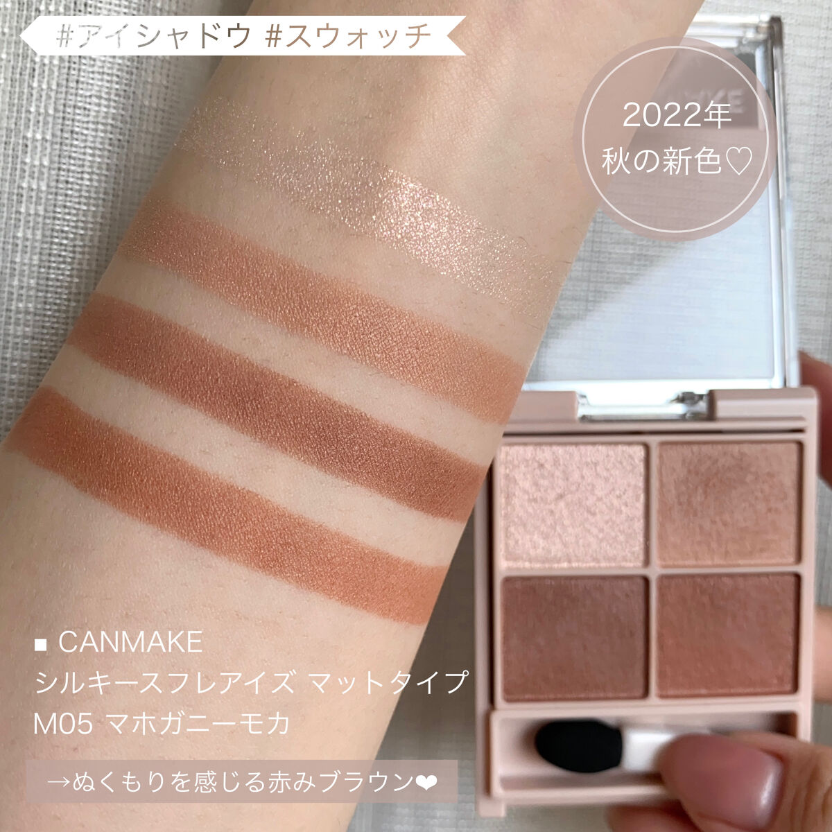 キャンメイク シルキースフレアイズマットタイプ今回はキャンメイクのシルキースフレアイズマットタイプ、"M02チャイブリック"をご紹介します✦質感✦マットアイシャドウ3色+ラメの4色パレットマットアイシャドウは韓国コスメのような完全にマットな質...