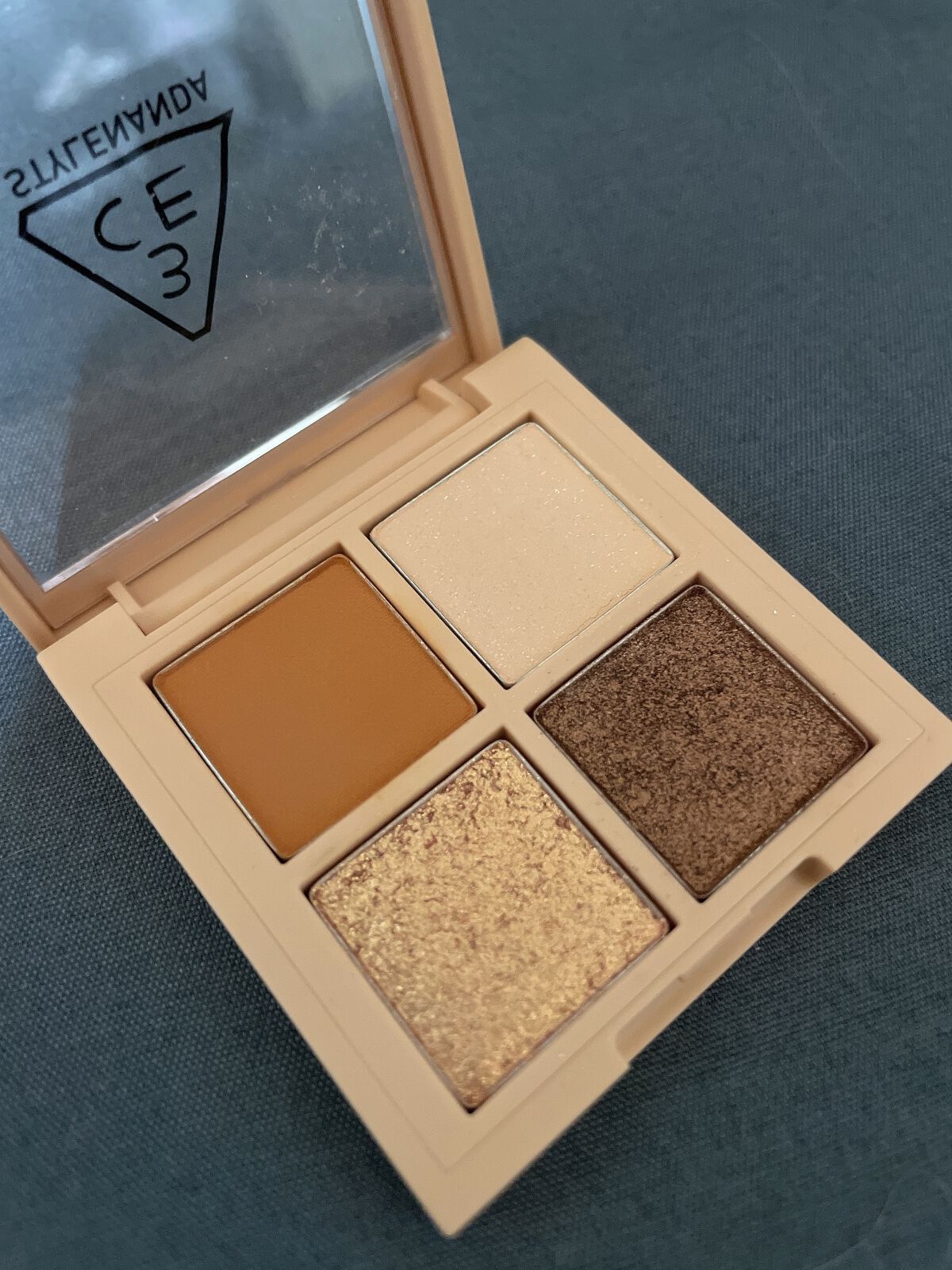 【3CEMINIMULTIEYECOLORPALETTE#ALMONDFUDGE】3CEから出ている手のひらサイズのミニパレット♡左上▶︎オレンジブラウンのマット右上▶︎ベージュカラーにちらちらラメ右下▶︎ゴールドラメ入りのダークブラウン左下...