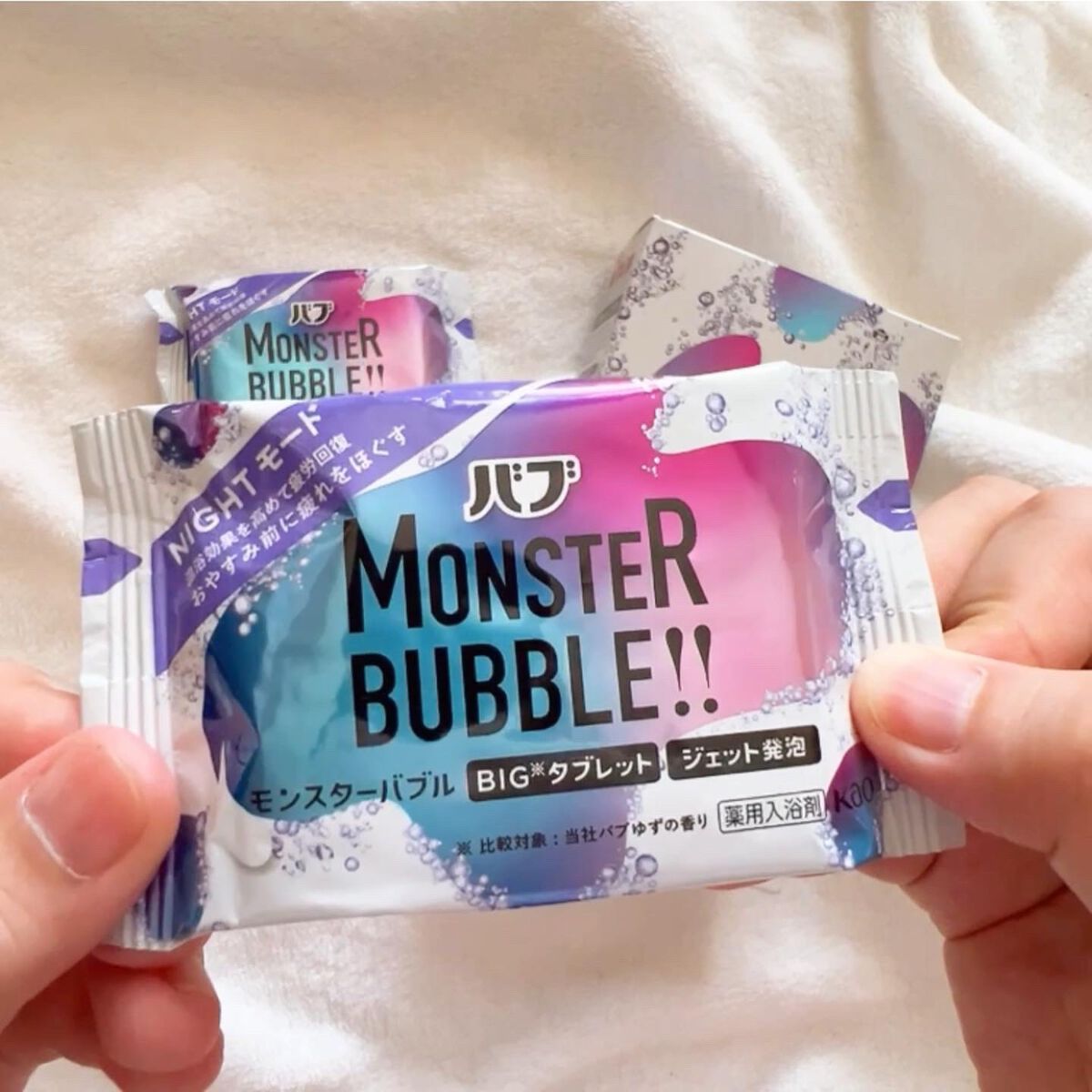 バブモンスターバブル NIGHTモードジュワっと回復!強炭酸チャージ**勢いよく発泡しながら、炭酸がお湯に溶け込むこと時々ひとりでお風呂タイムを楽しんでいます💕そんなときに欠かせないのは入浴剤✨今回使ってみたバブモンスターバブル NIGHTモ...