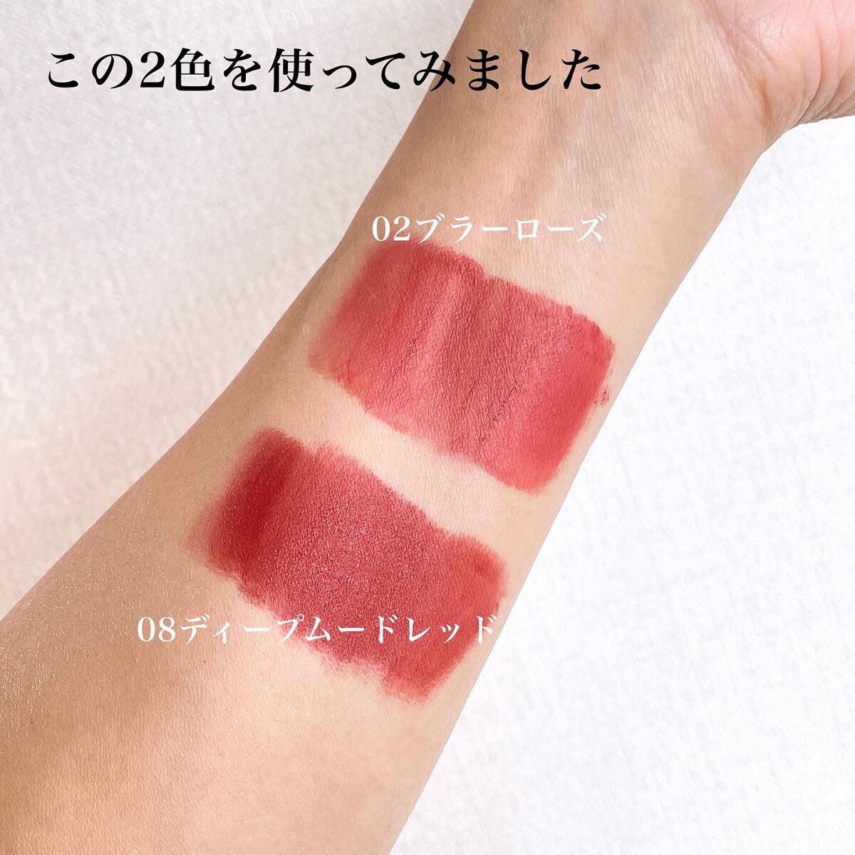 ▪️ムースのように軽くてさらっと唇を包み込む ▪️ベタついたり、固まらず柔らかく密着 ▪️空気のように軽く広がる ▪️角質に負担なく滑らかに唇にフィット 塗り心地が軽くて凄く良い◎ ティントですが、唇が荒れることなく使えています💓 スルスル塗れて固まらないので指でポンポン伸ばしやすいです✨ グラデーションもとても作りやすいです♡ 02は普段使いしやすく、08はブラウンやレッドが苦手な方でも使いカラーだと思います✨ 秋メイクにピッタリなカラーです💓 色持ちも◎なにより唇が荒れないので気に入りました☺️