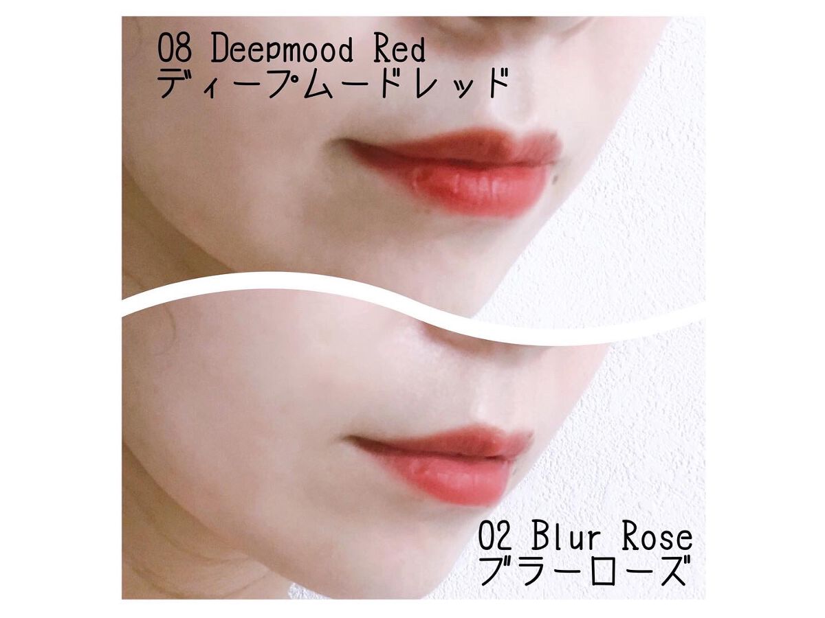 空気のように軽く広がるエアブレンディング。 滑らかでさらっとしたベルベット唇! 甘い香りが香るベルベットティント! 柔らかく軽いつけ心地で滑るように唇に乗せられます♡ ティッシュオフしてもしっかり色が残っていてマスクしてても取れにくい! 塗る→ティッシュオフを数回繰り返すとティッシュオフのあともしっかりカラーが残り、マスクにも付きにくかったです!