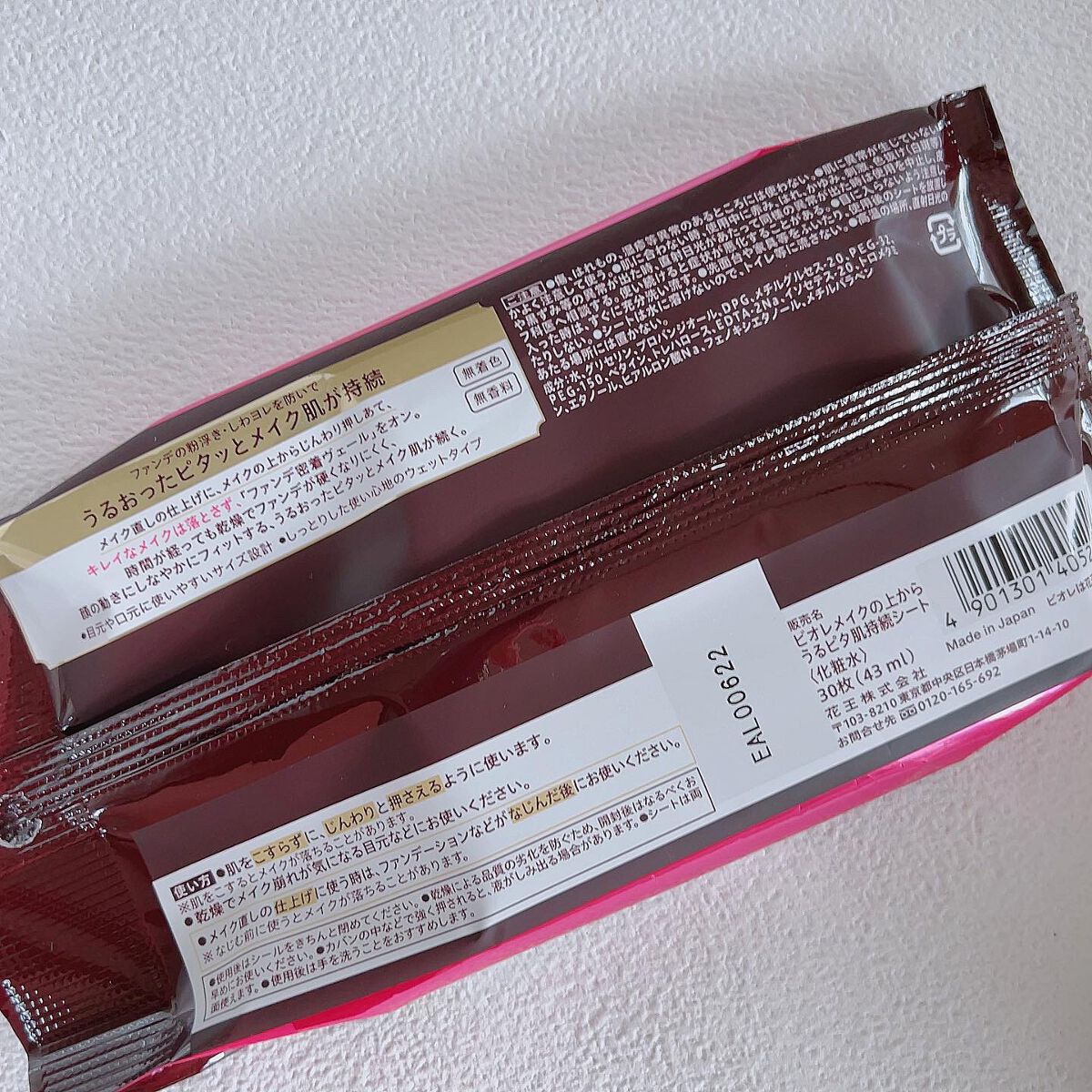 ビオレ様より商品提供していだたきました。Bioreメイクの上からうるピタ肌持続シート10枚入試供品試供品なので10枚入ですがコスパ良さげ◎《特徴》ファンデの粉浮き・しわヨレ防ぐ朝のメイクを密着ロック*¹!*¹うるピタ肌続く:シートによるメイク...