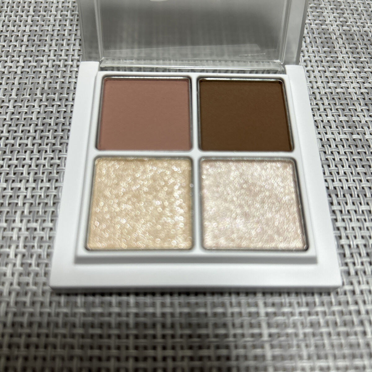 右上をアイホールと下瞼全体に 左上を二重幅目尻側から目頭側にぼかしながらのせる 左下を二重幅目尻側1/3(黒目にかかる程度まで)にしっかりとのせる 右下を下瞼1/3にのせる