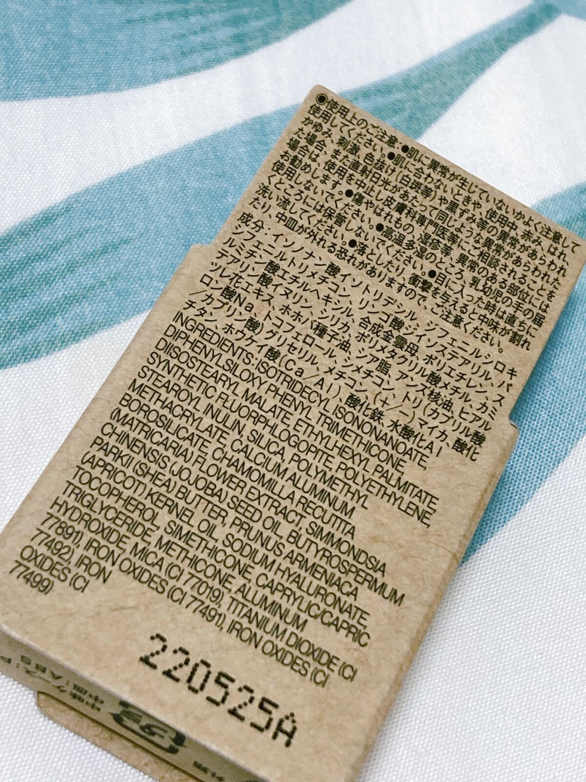 - <オレンジブラウン> イソノナン酸イソトリデシル、ジフェニルシロキシフェニルトリメチコン、リンゴ酸ジイソステアリル、パルミチン酸エチルヘキシル、合成金雲母、ポリエチレン、ステアリン酸イヌリン、シリカ、ポリメタクリル酸メチル、カミツレ花エキス、ホホバ種子油、シア脂、アンズ核油、ヒアルロン酸Na、トコフェロール、シメチコン、トリ(カプリル酸/カプリン酸)グリセリル、メチコン、(+/-)マイカ、酸化チタン、ホウケイ酸(Ca/Al)、酸化鉄、水酸化Al 色 <ブラウン> イソノナン酸イソトリデシル、ジフェニルシロキシフェニルトリメチコン、リンゴ酸ジイソステアリル、パルミチン酸エチルヘキシル、合成金雲母、ポリエチレン、ステアリン酸イヌリン、シリカ、ポリメタクリル酸メチル、カミツレ花エキス、ホホバ種子油、シア脂、アンズ核油、ヒアルロン酸Na、トコフェロール、シメチコン、トリ(カプリル酸/カプリン酸)グリセリル、メチコン、(+/-)マイカ、酸化チタン、ホウケイ酸(Ca/Al)、酸化鉄、水酸化Al <ピンクベージュ> イソノナン酸イソトリデシル、ジフェニルシロキシフェニルトリメチコン、リンゴ酸ジイソステアリル、パルミチン酸エチルヘキシル、合成金雲母、ポリエチレン、ステアリン酸イヌリン、シリカ、ポリメタクリル酸メチル、カミツレ花エキス、ホホバ種子油、シア脂、アンズ核油、ヒアルロン酸Na、トコフェロール、シメチコン、トリ(カプリル酸/カプリン酸)グリセリル、メチコン、(+/-)マイカ、酸化チタン、ホウケイ酸(Ca/Al)、酸化鉄、水酸化Al