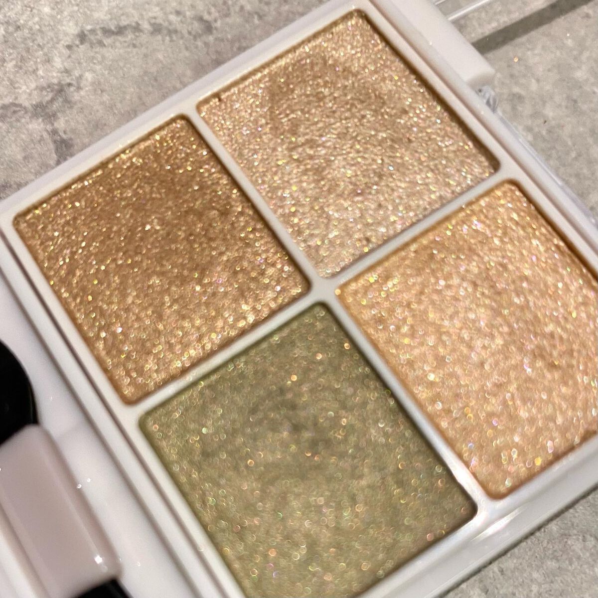 うん、やっぱ可愛い!♡ 神配色👏🏻 今の時期より夏に登場頻度増えそう🙌 ギラギラゴールドがタイプすぎる♡ 左:イエローゴールドシマー ⇒コッパーとゴールドのラメがたっぷり! 大粒ラメがギラギラ夏っぽい 右:シマリングライトピーチ ⇒発色は薄いもののベースや涙袋にだ活躍してくれる ピンクベージュ 左:オレンジ&ゴールデンシマー ⇒ありそうでなかったオレンジカラー オレンジからのゴールドの偏光がたまらない🍊 右:マットパープルレッド ⇒かなり濃いめのパープル!オレンジメイクにアクセントと深みを出してくれる
