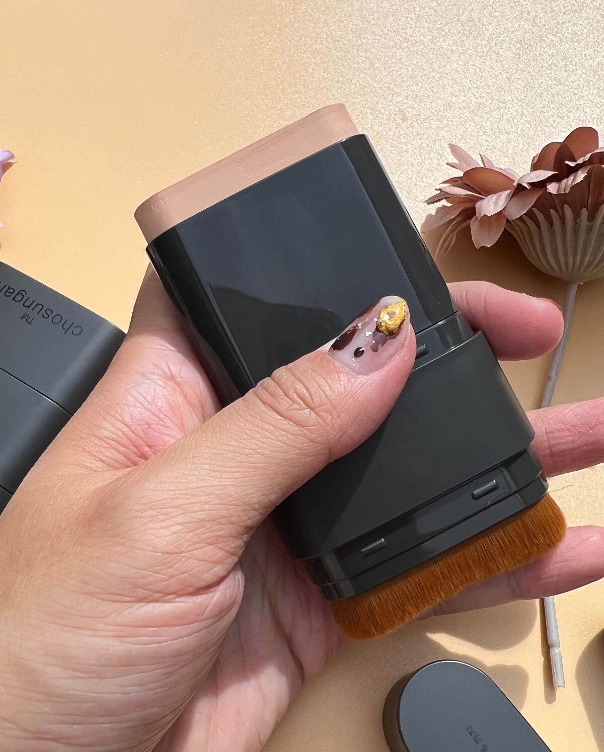 CHOSUNGAHBEAUTY(チョソンアビューティー)のクルクル回して使う便利なスティックタイプのメガーフィットスティックファウンデーション♪しっとりしてるのに軽いテクスチャーが心地よい手を汚さず塗れちゃうファンデ!お尻側がブラシになってる...