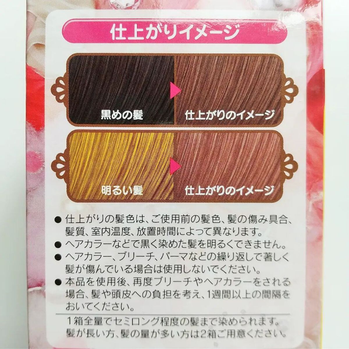 - トーンアップ処方で黒髪でも高発色の明るいカラーに。自分らしく輝く鮮やかなツヤ髪色へ。 ①Wオイル*1成分で輝く髪色へ! ②髪にうるおいを与える8種類のアミノ酸*2を配合 ③うるツヤケラチントリートメント付き ・ダメージ補修 ・うるおい補給 ・髪色ケア サロンで話題のケラチン成分2種類配合。髪内部にケラチンタンパク質*3を届けてダメージを補修。 *1オクチルドデカノール、流動パラフィン:(エモリエント成分) *2セリン、グリシン、グルタミン酸、アラニン、アルギニン、リシン、スレオニン、プロリン:(保湿成分) *3ステアルジモニウムヒドロキシプロピル加水分解ケラチン(羊毛)、加水分解ケラチン(羊毛):(毛髪補修成分) 1剤:40g 2剤:80mL【医薬部外品】/ヘアトリートメント:15g 【化粧品】 使用説明書/手袋/くし型ノズル 2024年3月11日~パッケージリニューアル