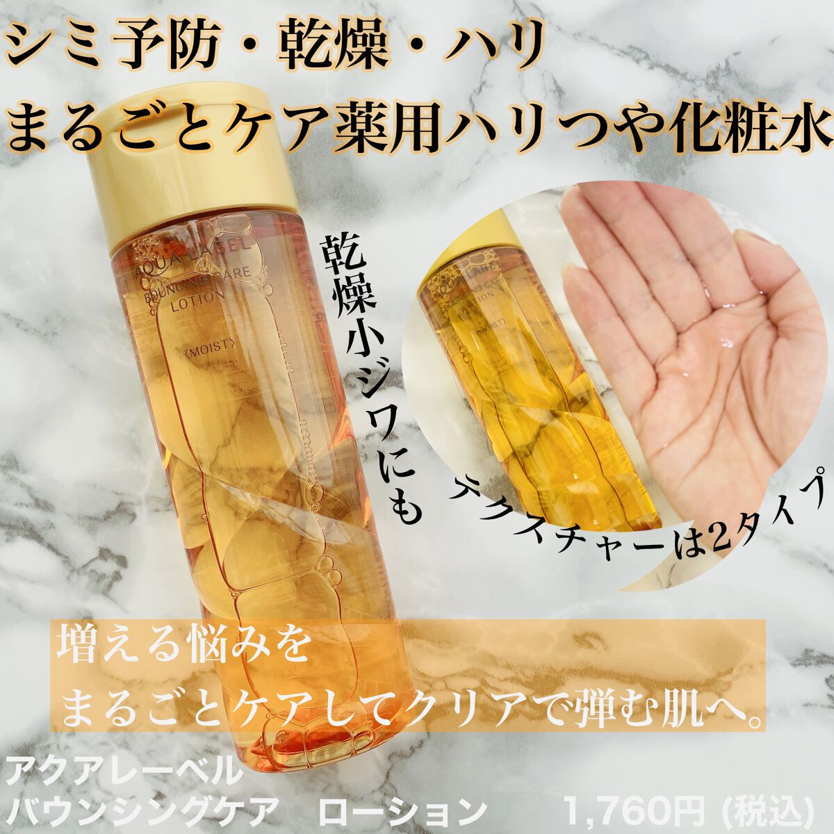 シミ予防、乾燥、ハリ、エイジングケアする高機能化粧水。超しっとりタイプ 洗顔後、このローションだけでもかなりしっとりします。500円玉ぐらいの量だけで充分うるおって、ツヤのある肌質になります。 これに同じアクアレーベルのオールインワンを使うと一日中しっとり肌です!