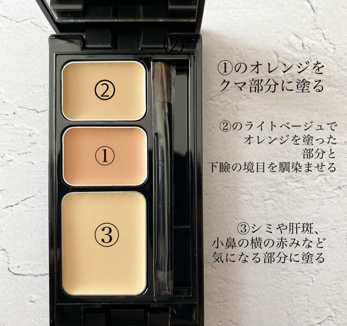 - SPF36 PA+++ シミやクマ、ニキビ跡など隠したいポイントに合わせて自由に色をカスタマイズ出来るコンシーラーパレット。 ナチュラル・オークル・オレンジを組み合わせることで、気になるポイントをより自然にカバー出来ます。 さらに、付属のブラシは筆とスポンジの2wayになっており、広範囲のクマには筆を、シミやニキビ跡などポイント部分にはスポンジと使い分けが可能。 3色×2wayブラシで自由自在に肌色補正が可能です。