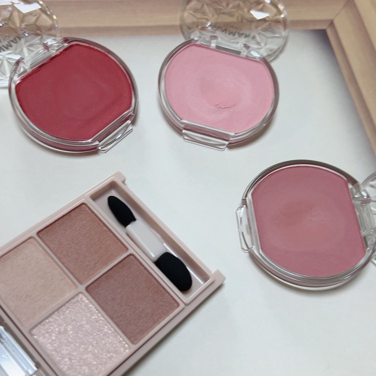 発売が発表されてから買おうと決めていたキャンメイク 新作チーク🥹🤍 マットタイプパールタイプのピンク系チークも合わせて紹介するよ〜💫 23 キューピッドピンクは青み感じる明るめピンク🪽白っぽさもあるんだけど血色感もプラスしてくれるような程よいカラーでかわいい💗 ツヤタイプだけど質感はふわっさらっとしていてベタつく感じもないです👏🏻この中だと一番青みが強め💜