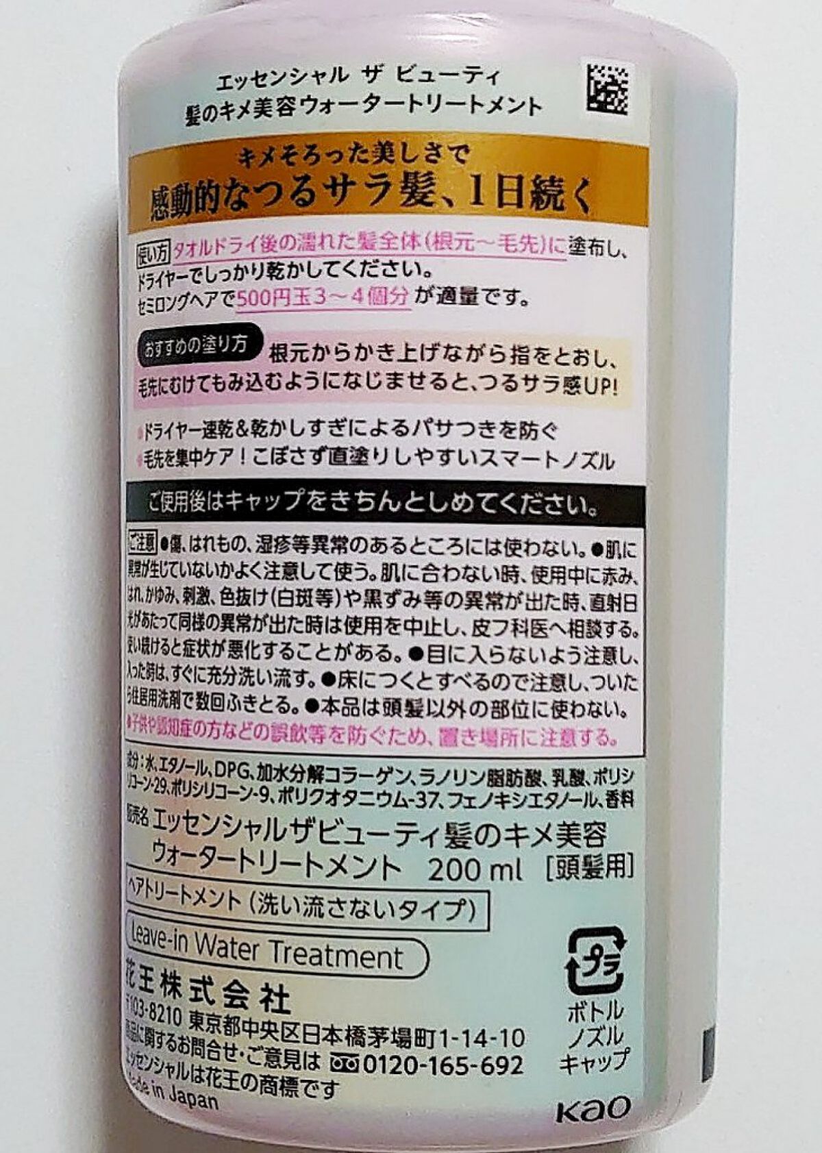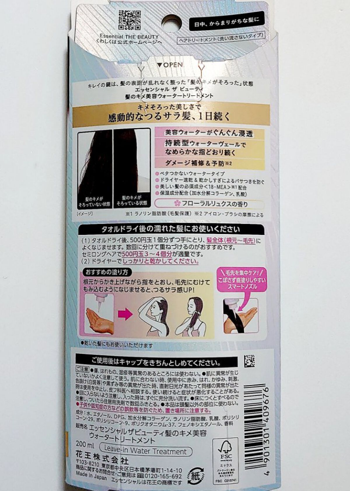 エッセンシャルザビューティ髪のキメ美容ウォータートリートメントホワイトティーの香りの感想です。洗い流さないウォータートリートメント持続型ウォーターベールでなめらかな指通りへ【使用感】・ホワイトティーの香りがめっちゃいい・ドライヤー速乾はイマイ...