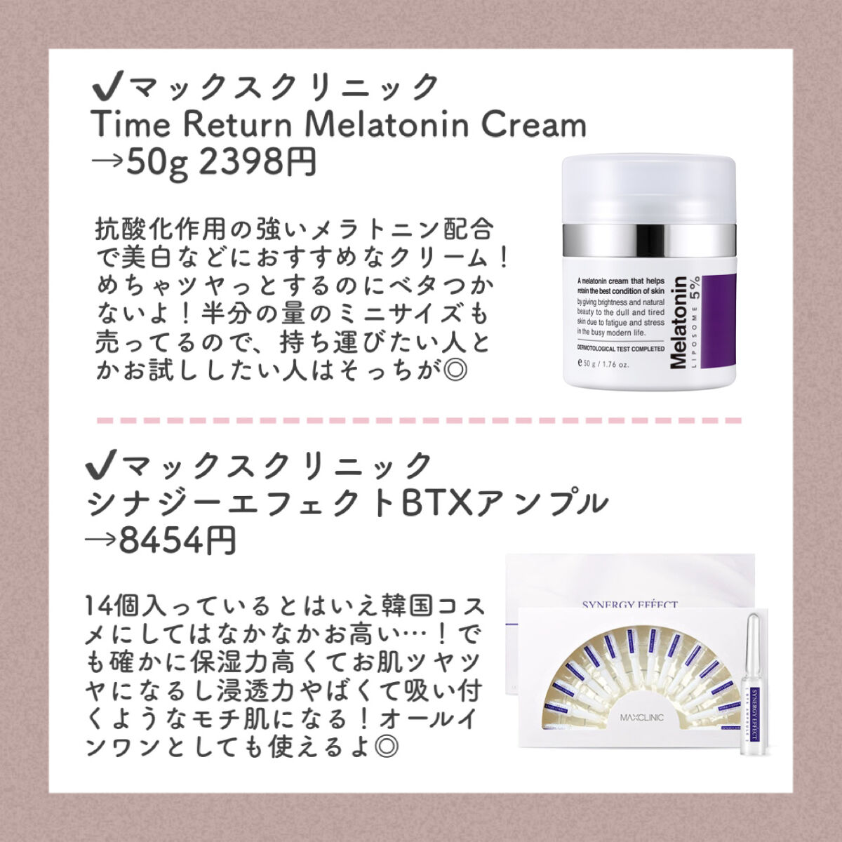 MAXCLINICの新商品✨肌の弾力や保湿ケアにピッタリなアンプル&クリームです。 Synergy Effect BTX Cream Ampoule 乾燥によって弾力を失った肌に良い一回使い切りタイプのアンプル。クリームとアンプルのメリットを一つにしたものでとろみのあるテクスチャーで塗ると保湿&艶感を感じれます。化粧水代わりにも◎旅行の時のスキンケアにもオススメやなと✈️ Time Return Melatonin Cream メラトニンクリームは好きで愛用してるのですが、ポンプ式の大容量として出ました🫶🏻ベタつかないのにしっかり保湿もしてくれて朝晩使いやすいので良きクリームです🙆🏻♀️夜たっぷり塗って寝るとぐっすり寝たような肌になれます。 マックスクリニックはしっかり効果的なのに価格帯も良心的でリピートしやすくて好きなブランド🇰🇷この組み合わせは秋冬に特にオススメ💕Qoo10でスーパーセールでお得に購入できるので要チェック☺️❣️