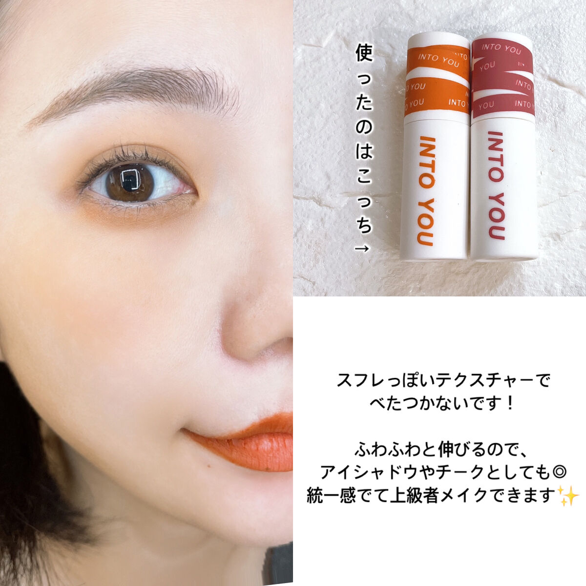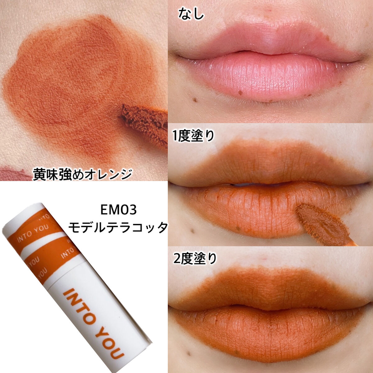 秋っぽ主役色! INTO U スーパーマットリップ&チークマッド EM08インフルエンサーモカ しっかり塗ると深ーい色味に! into u とinto youは同じ商品だそう🙌