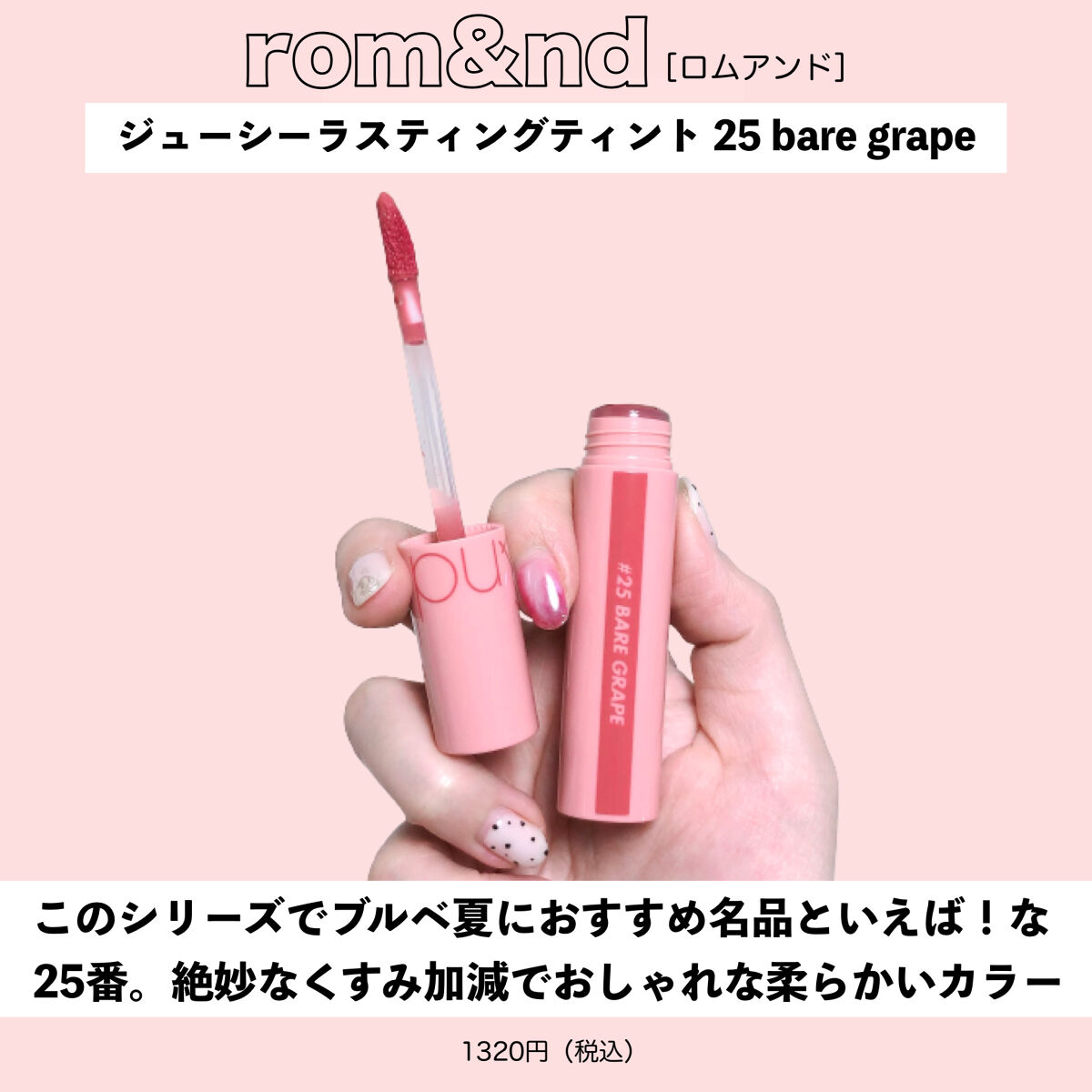 『ロムアンドの新色が万能すぎてどうかしてる件。』ロムアンドの大人気シリーズ『ジューシーラスティングティント』の夏の新色がかつてないほど使いやすいのです📝4色全部ヌード系で今までの既存色が発色良すぎて使うのが少し難易度高いなナチュ...
