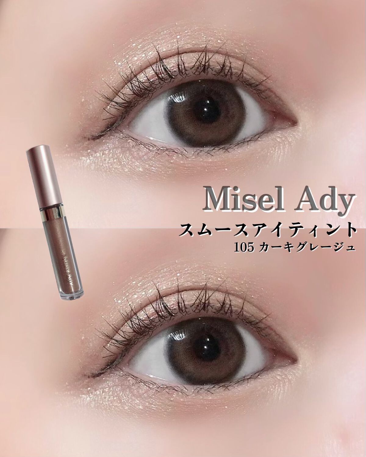 このスムースアイティントですが、リキッドアイシャドウにありがちなヨレかたや二重にたまってしまう現象はどこ??? といったくらい夕方までとても綺麗にキープできるんです。 チップでまぶたにそのままのせて、指でぼかして使うのですがちゃんとぼかせるのにしばらくするとキープされてヨレない。天才👏 ぼかすとキラキラなラメがしっかり見えてくるんだけどラメ飛びもほぼない!天才👏 まぶたの際にのせて、アイホールへ徐々に伸ばしていくのが綺麗にグラデーションを作れると思います。 104 アプリコットベージュ あんずのようなほんのり赤みのあるやわらかいベージュ。可愛らしい色味で目元が華やかになる印象。秋だけでなくオールシーズン使えそうなカラー。 105 カーキグレージュ 辛口すぎない女性らしいカーキグレージュ。秋らしいカーキ色だけど、グレージュが入ってるので肌馴染みがいい。クールな秋冬メイクに使えそう◎
