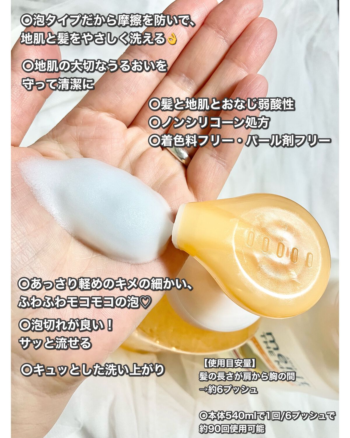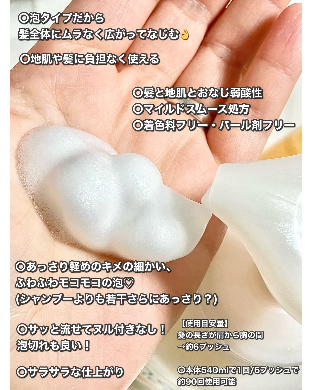 | 泡が髪全体にすーっと馴染み、ぬるつかず さっと流れて自然なさらさら髪に仕上がる | 詳細を見る | ||