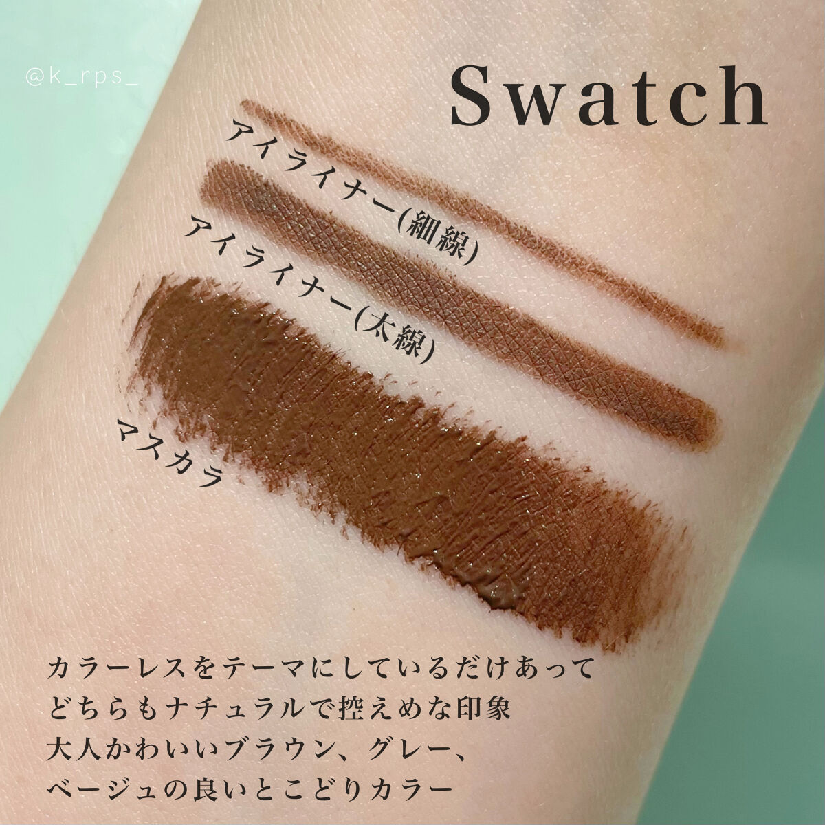 ふんわり上向きまつげを1日キープする、“ふんわりカール”マスカラ。まつげにするする絡んでダマにならず、なめらかに伸びて繊細な上向きまつげに仕上がります。 VOCEやMAQUIAなど有名美容誌で2023年にマスカラ部門 1位を獲得している大人気マスカラ!今回のカラーは【ピンクブラウン】です。ブラウンベースで自まつ毛にもなじみやすいくすみピンク。 こちらも同じく人気美容誌等でベストコスメを受賞しているアイライナー。今回のカラーは【ピーチブラウン】です。濃厚なブラウンにほんのり赤みをプラスしたカラー。