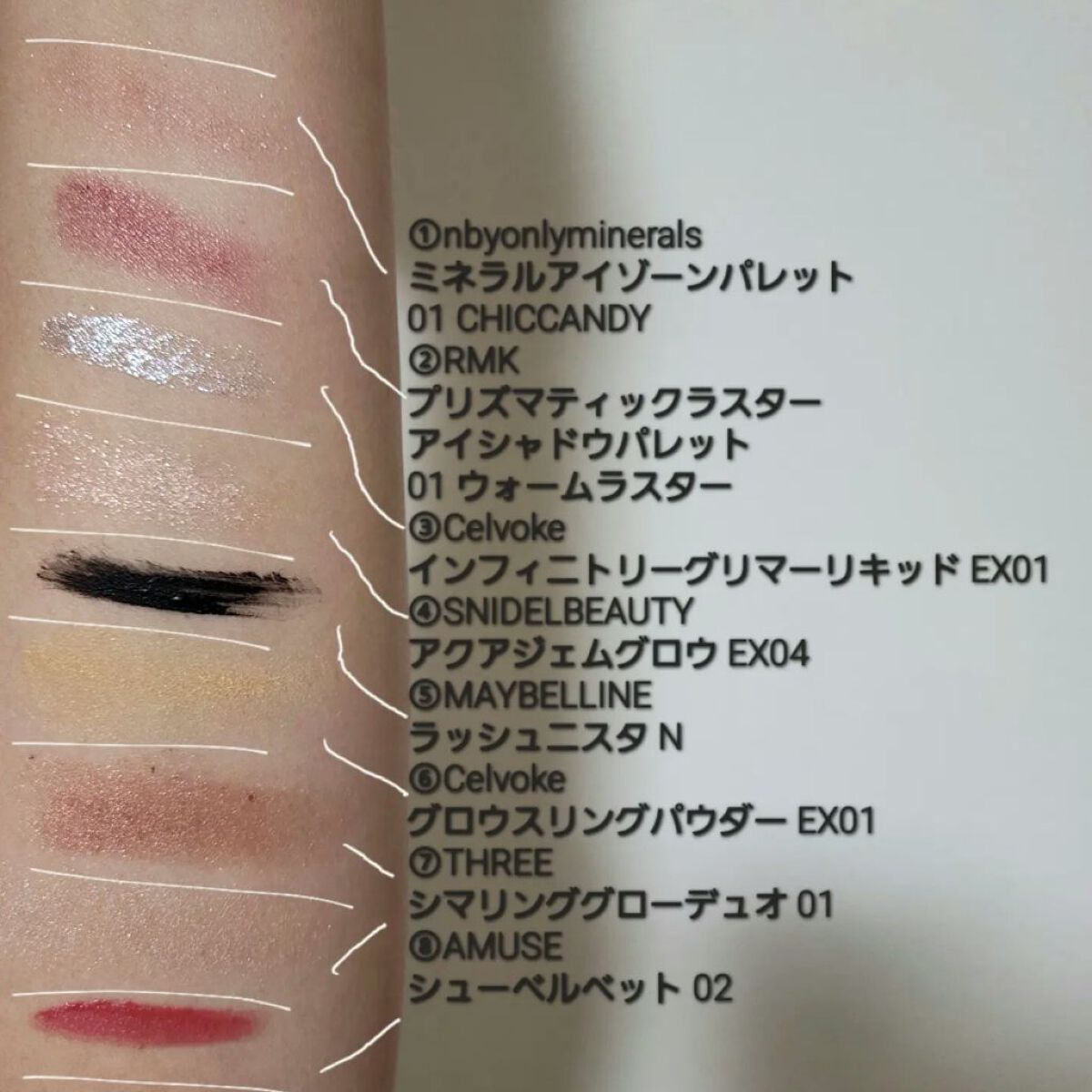 アイブロウは #WHOMEE の#レディモーヴ を。 #celvoke の #ヴォランタリーアイズ Sのアンバーを上下の瞼に指で馴染ませる。 #hince の #ニューアンビエンスカラーアイライナーの#インフューズドを上瞼の黒目上辺りから目尻に掛けて目の際にアイラインを✨ #SNIDELBEAUTY の #フェイススタイリストのa スパークリングゴールドを上瞼の黒目上に。 #SNIDELBEAUTY の #フェイススタイリストのb フロステッドシルバーを下瞼の黒目下に。 #toonecosmetics の #ロングラッシュマスカラ 05を上睫毛だけに付ける。 チークは ⑤③と同じパレットの血色感チークを。 リップは #ヒンス の #ムードインハンサーマットのアドレスを塗る。 #shirocosmetics の #エッセンスリップオイルカラー 0A04をチョチョンと重ねる💋✨ ベージュのアイライナーは抜け感というのかな✨ ゴールドとシルバーのラメは万能です👏