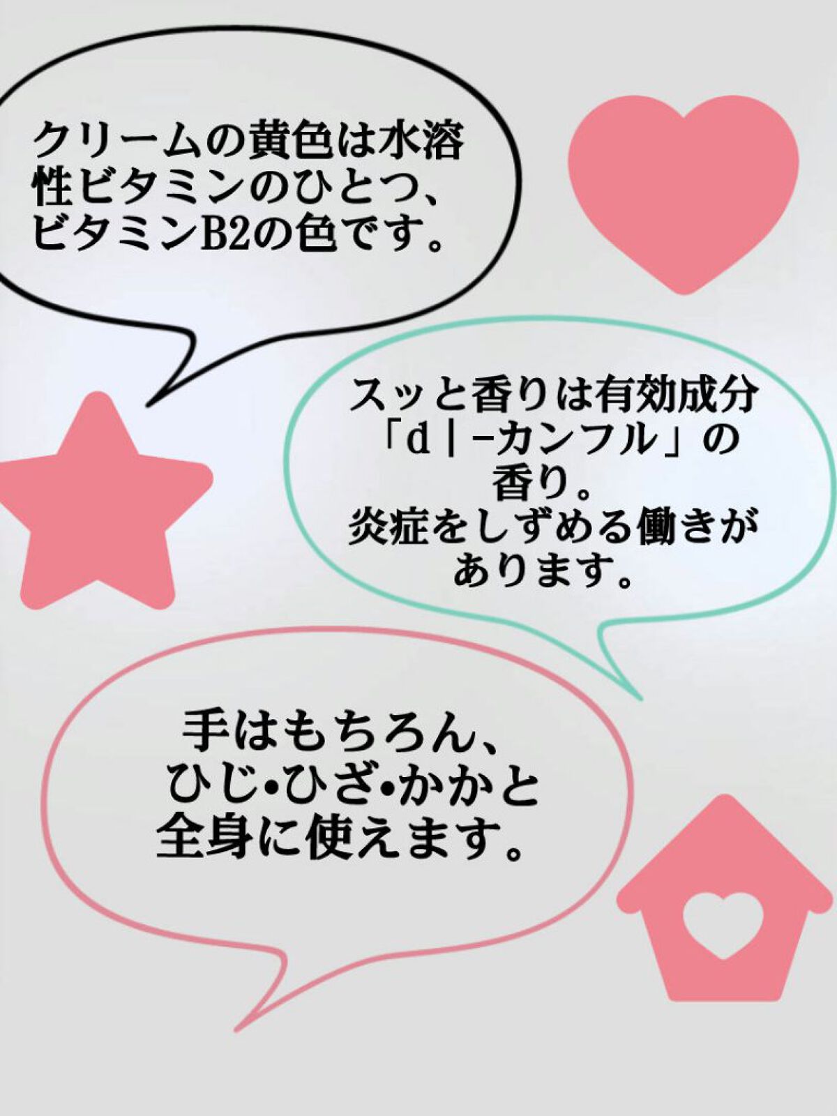 - 【指定医薬部外品】 ● 4つの有効成分が「ひび・あかぎれ・しもやけ」を治します。 ● 2つのうるおい成分がお肌にうるおいを与えます。 ● クリームの黄色は、水溶性ビタミンのひとつ「ビタミンB2」の色です。(保湿成分) ● スッとする香りは、有効成分「dl-カンフル」の香りです。 ● 塗ったあとすぐに肌がうるおい、優れた保湿効果が持続します。 ● お肌に合えば全身にお使いいただけます。