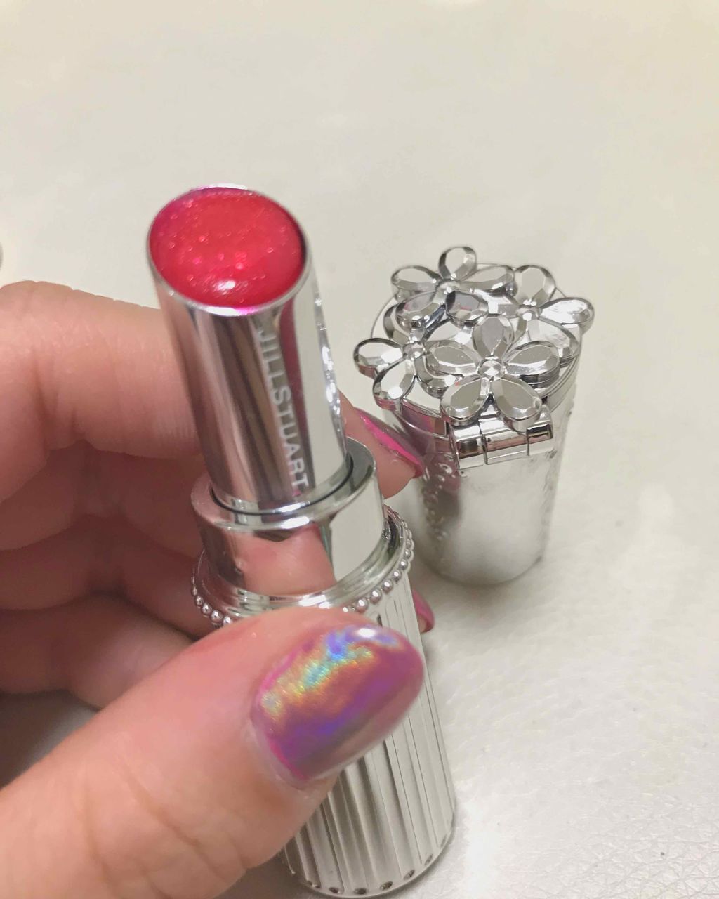 ジルスチュアートリップブロッサム50番🌸ぱっと見赤っぽく見えますが、実際塗ってみるとピンクぽいです!ラメがざっくざく入ってて、もうかんわいいです😳💕これ単体で使うのもありだとは思うんですが、わたしはギラギラしすぎかなぁと感じるので、いつも他の...