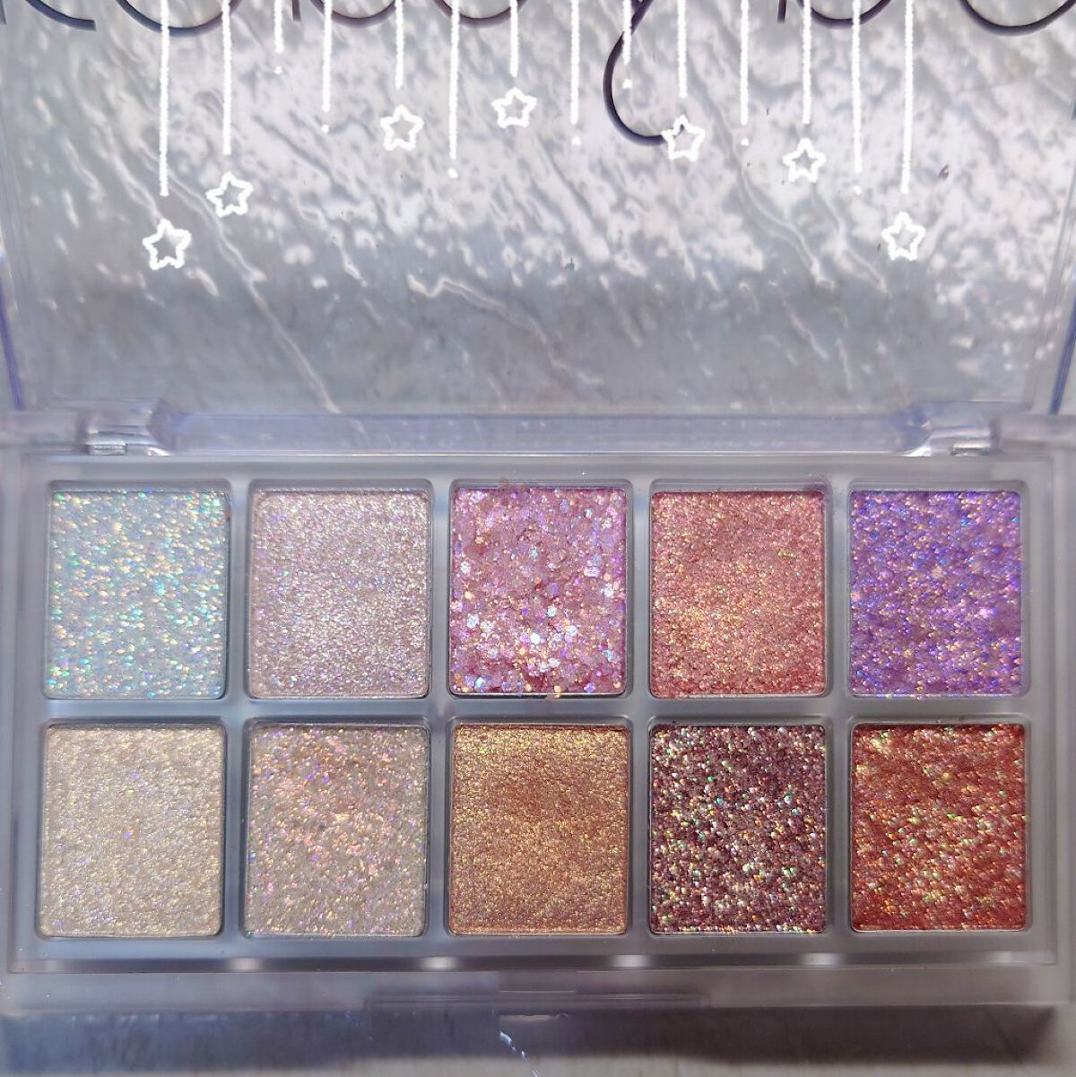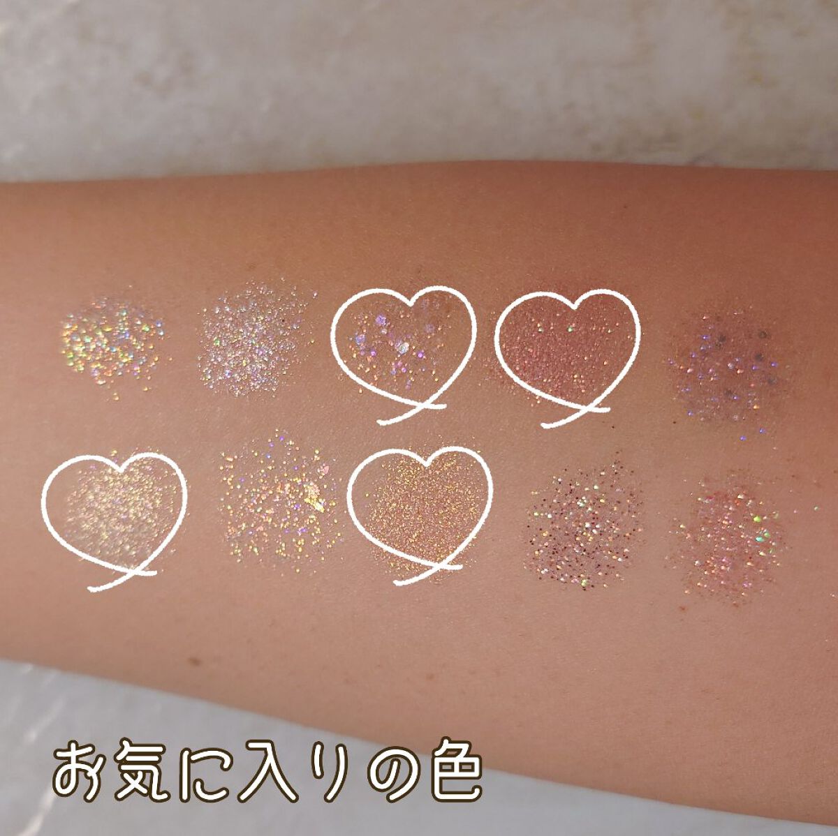 大粒から小粒まで色んな形のラメが詰まった10色パレット💎🌈 10色も入ってるから色んなメイクに合うグリッターが見つけられて1つは持っておくべきです🥺🫶🏻 ②のカラーが涙袋にピッタリでこれひと塗りすれば時短で涙袋爆誕します ラメ飛びしにくい